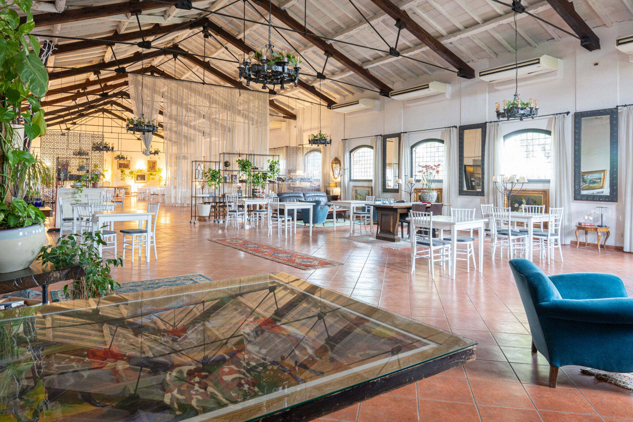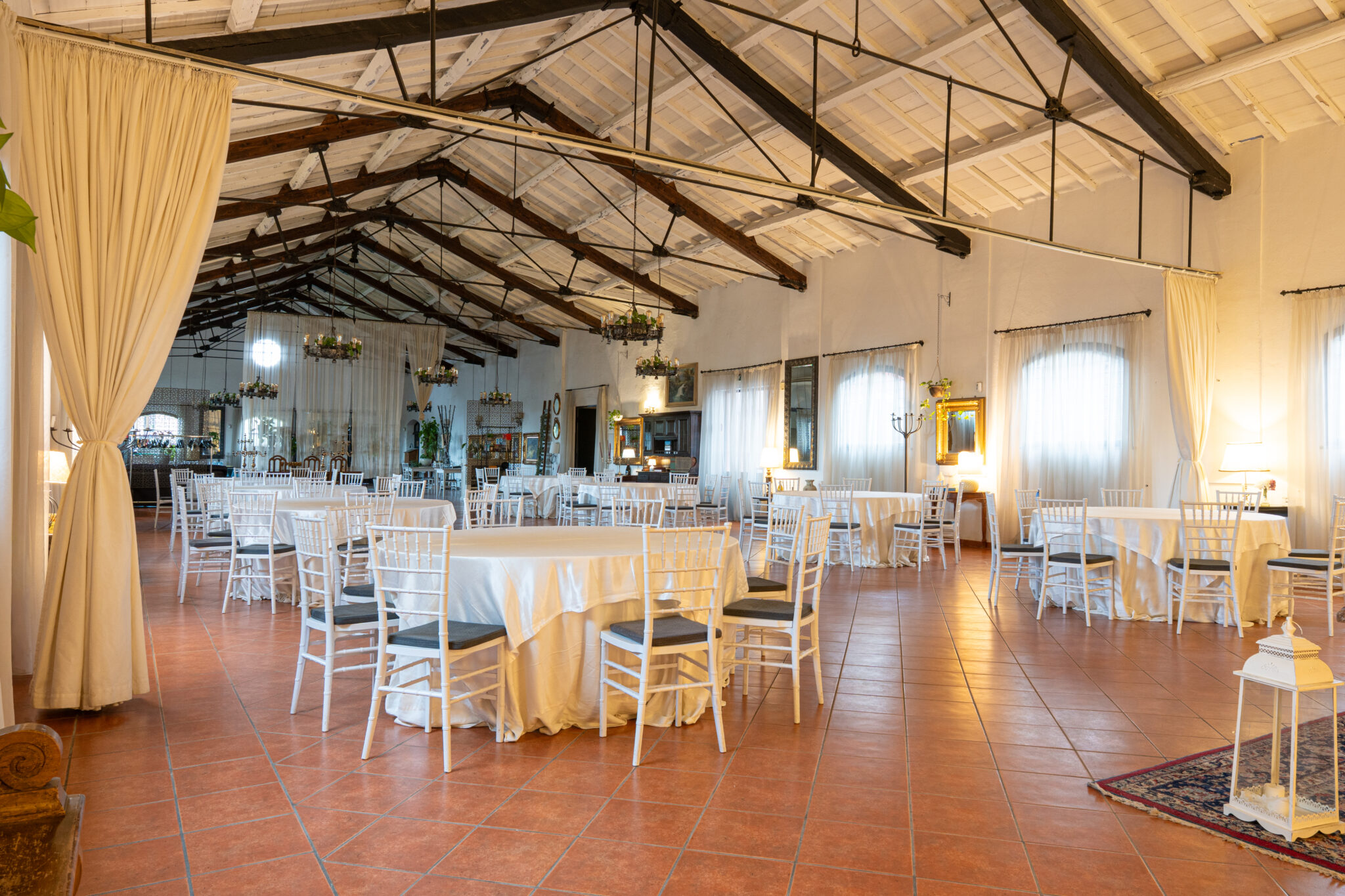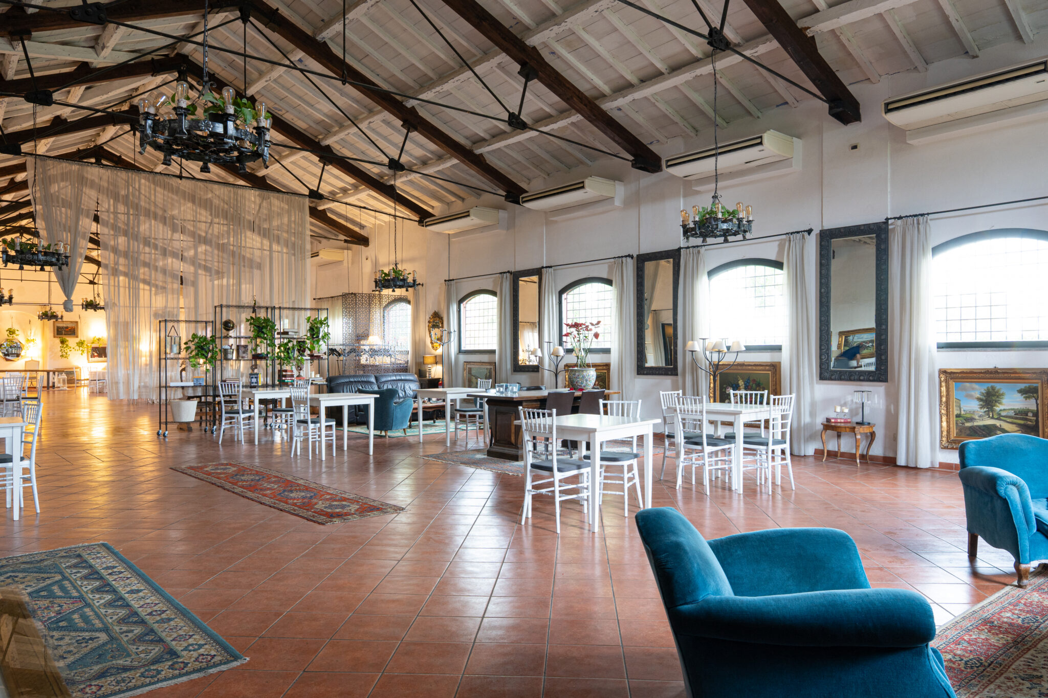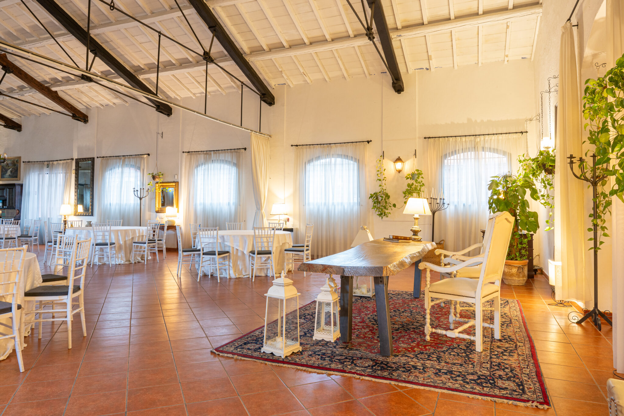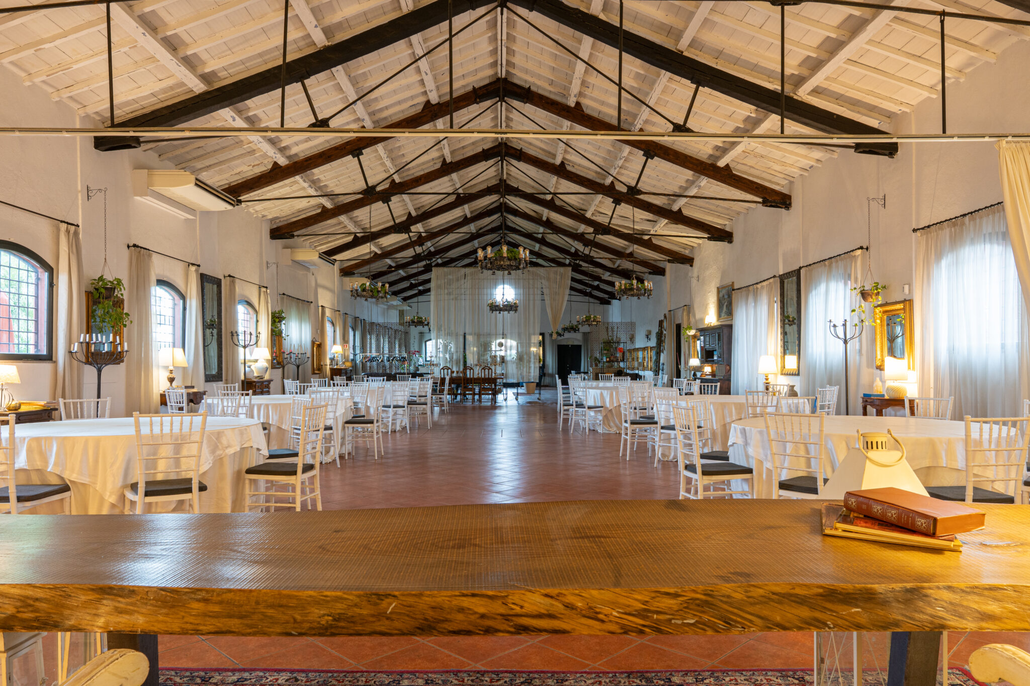 Circa 500 mq di spazio interno caratterizzato da un ampio salone open space con soffitti alti e travi in legno a vista, grandi finestre ad arco che illuminano l’ambiente e una zona bar dedicata.