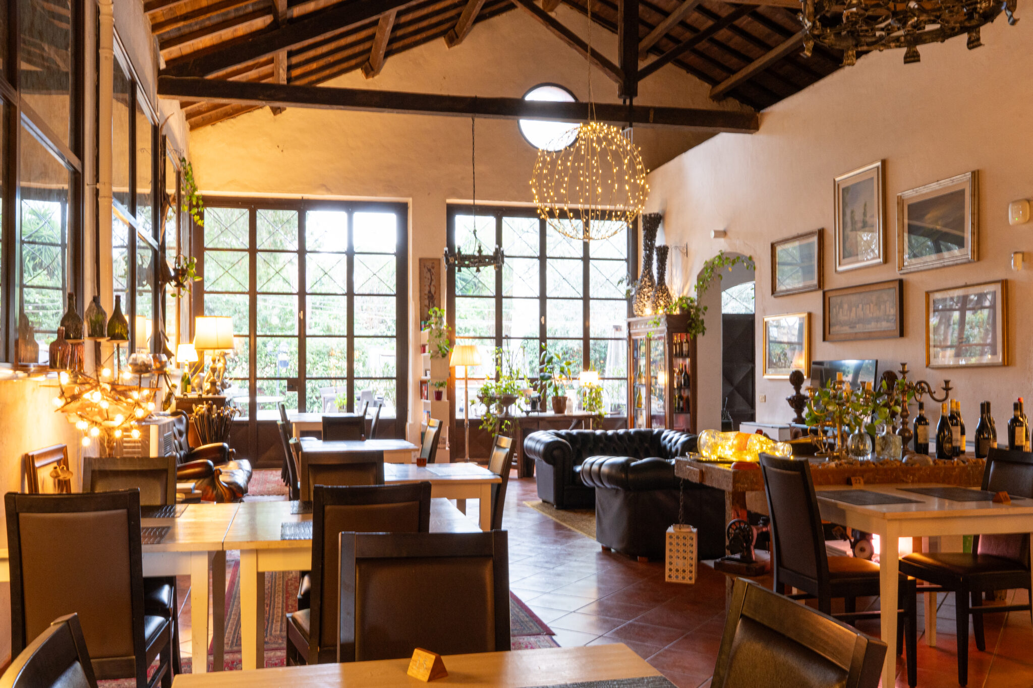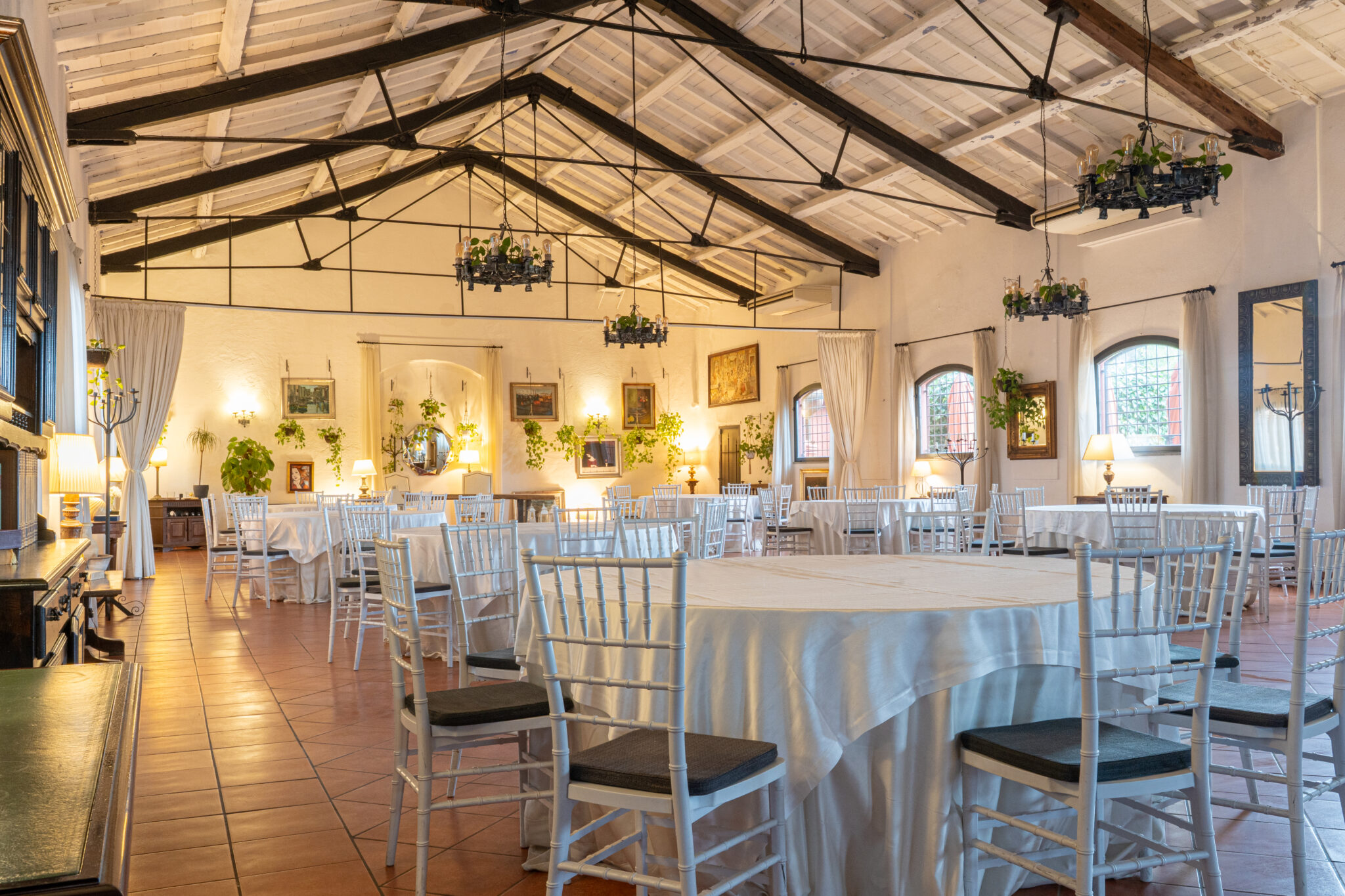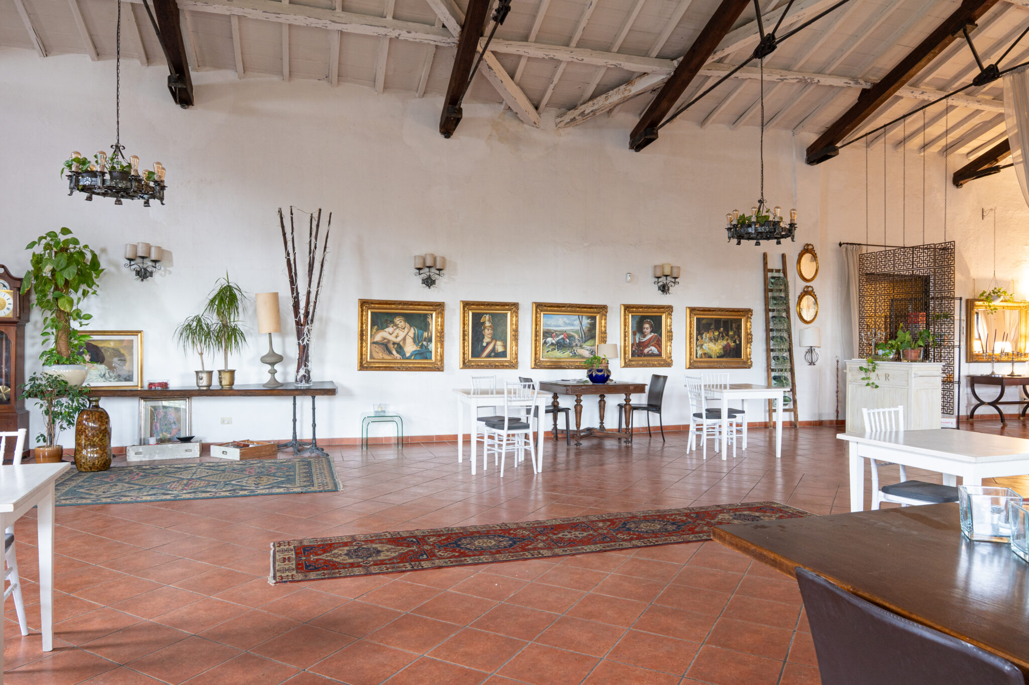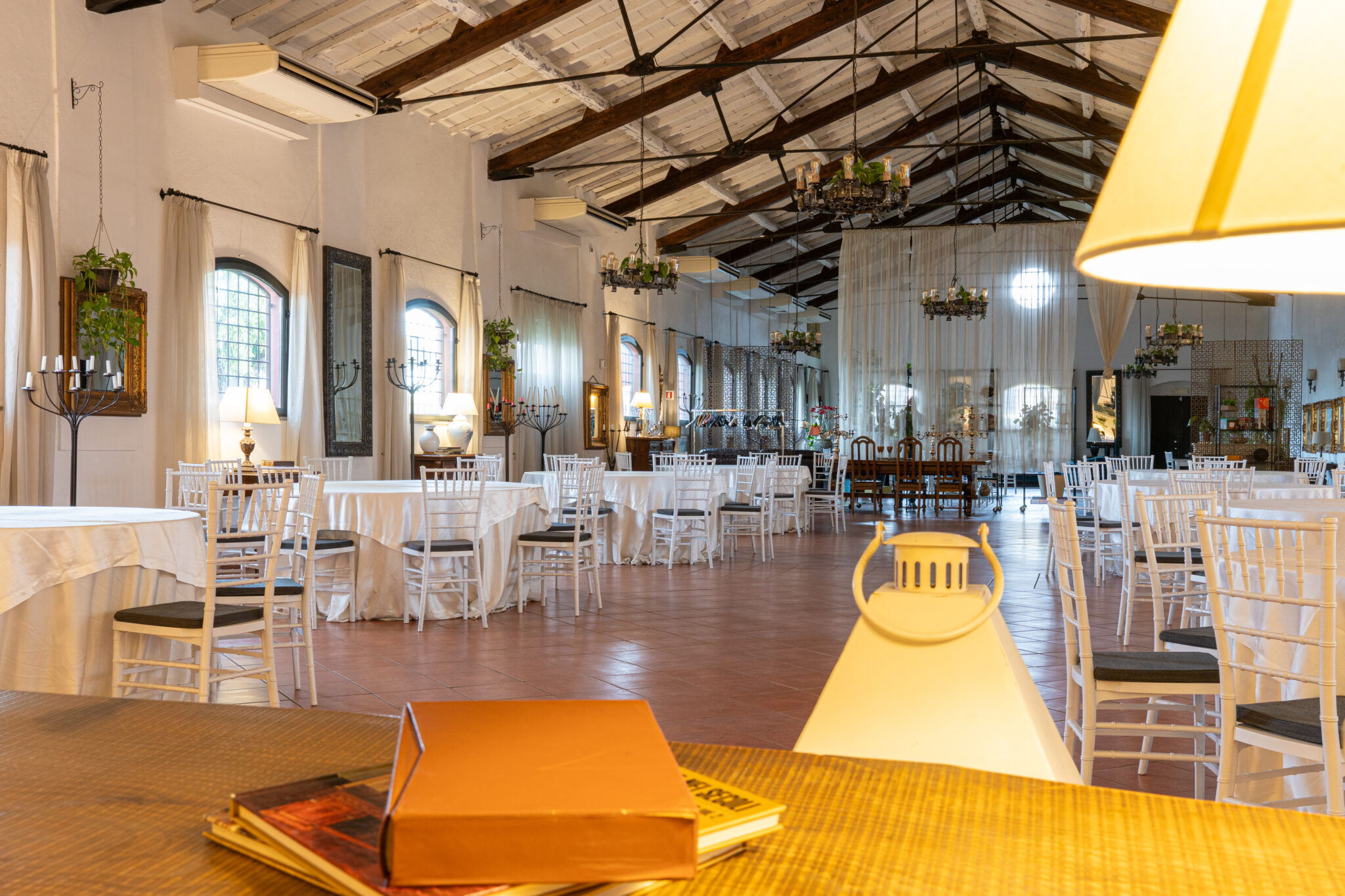 Circa 500 mq di spazio interno caratterizzato da un ampio salone open space con soffitti alti e travi in legno a vista, grandi finestre ad arco che illuminano l’ambiente e una zona bar dedicata.