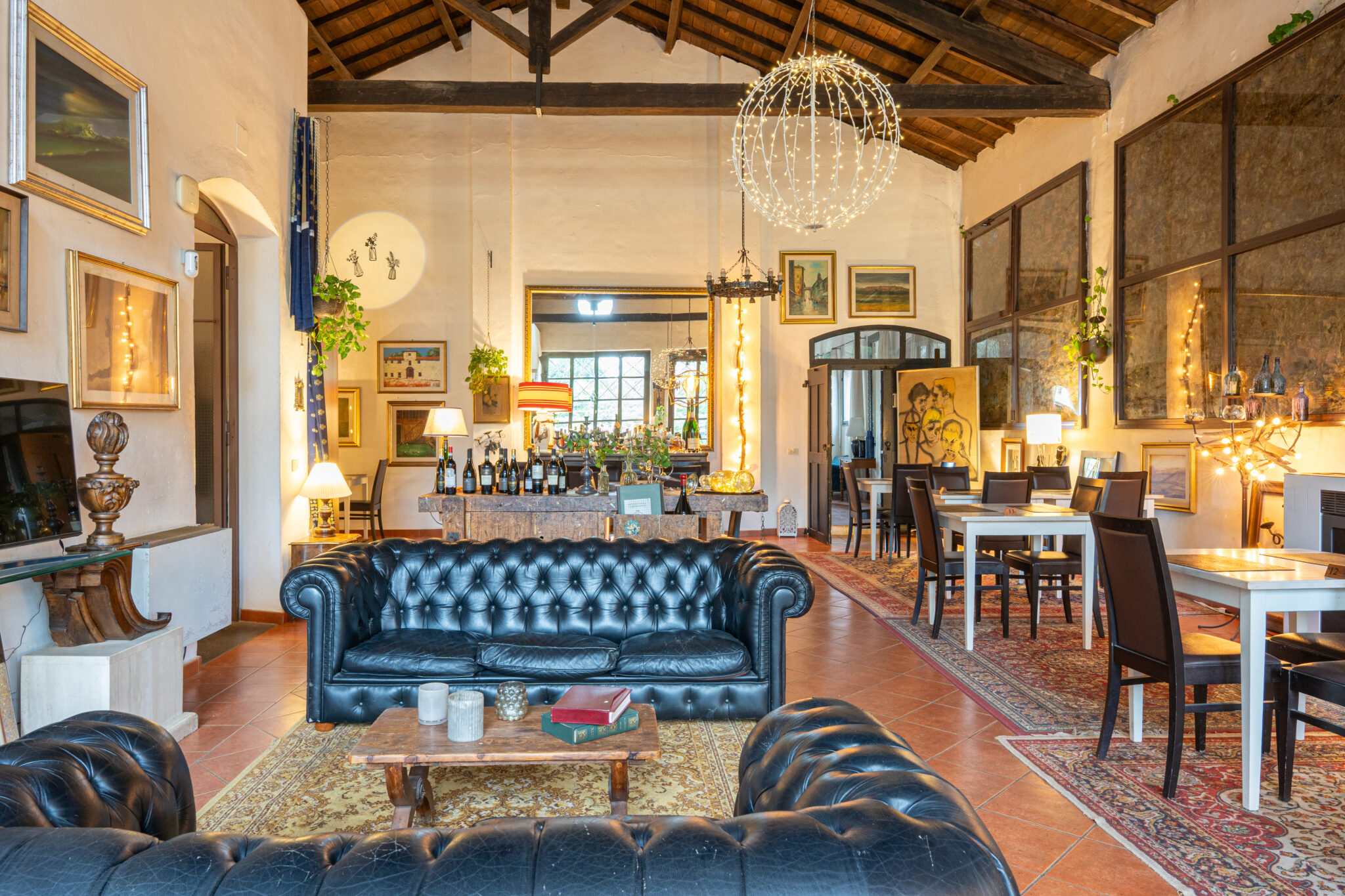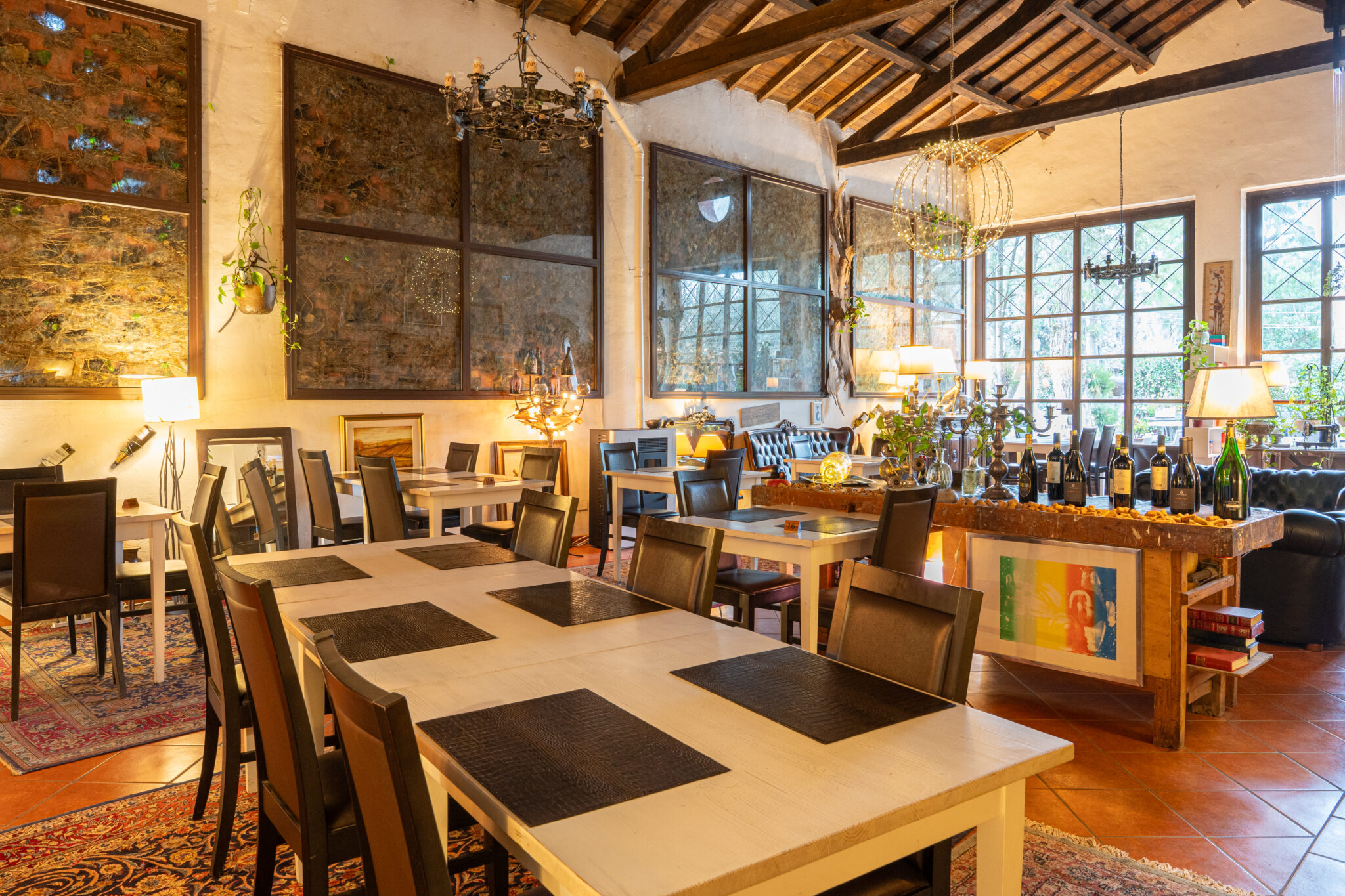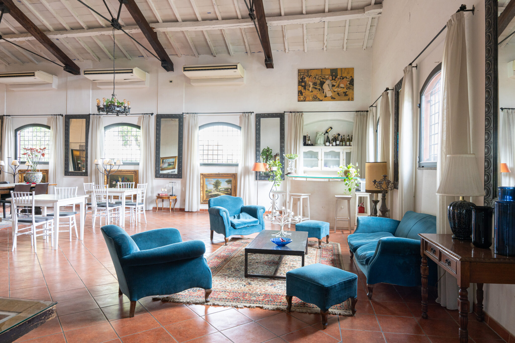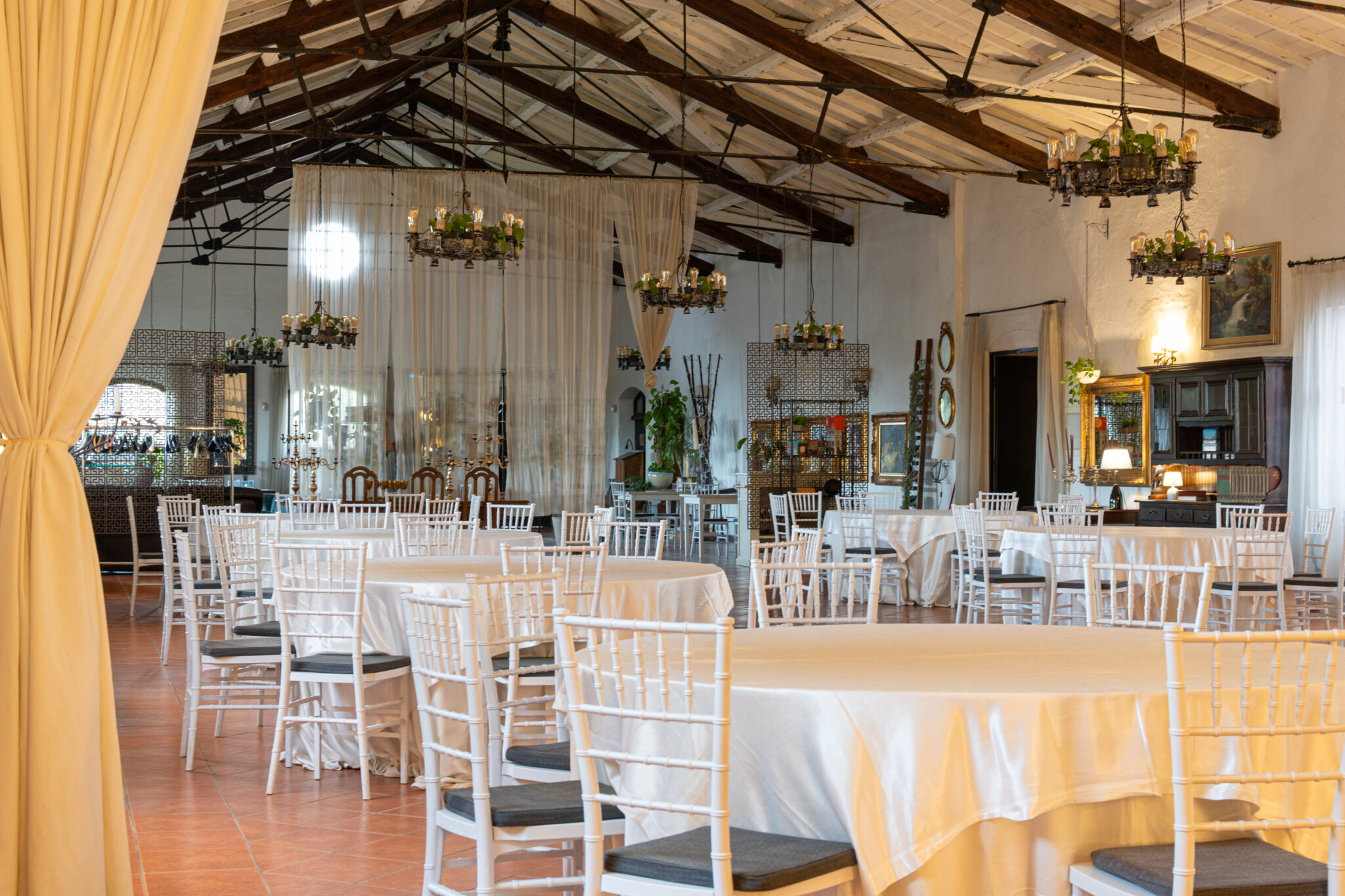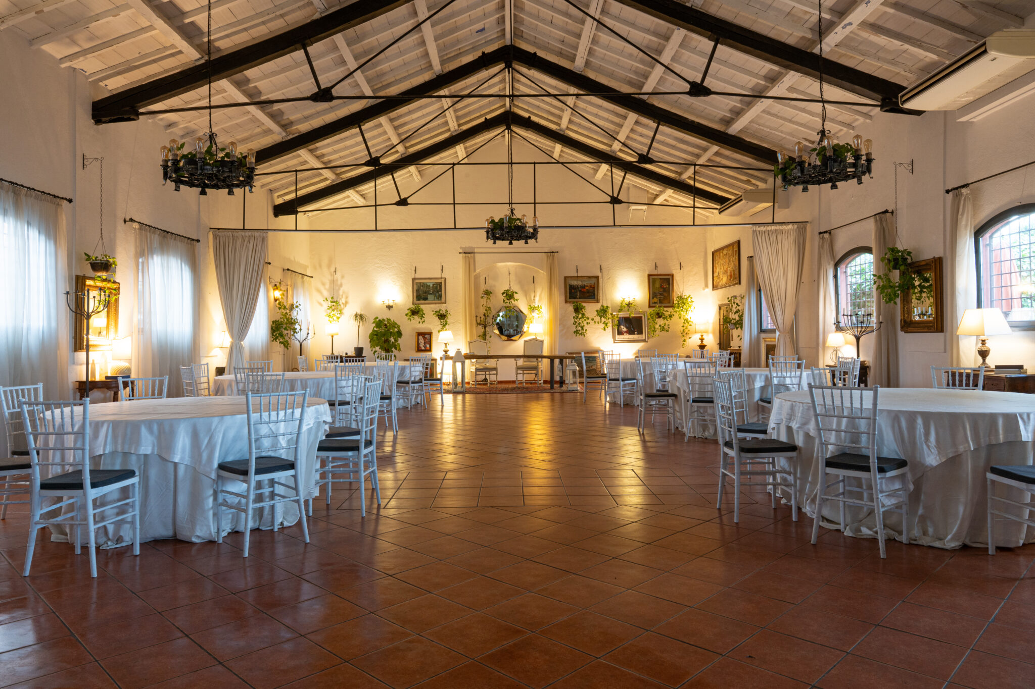 Circa 500 mq di spazio interno caratterizzato da un ampio salone open space con soffitti alti e travi in legno a vista, grandi finestre ad arco che illuminano l’ambiente e una zona bar dedicata.