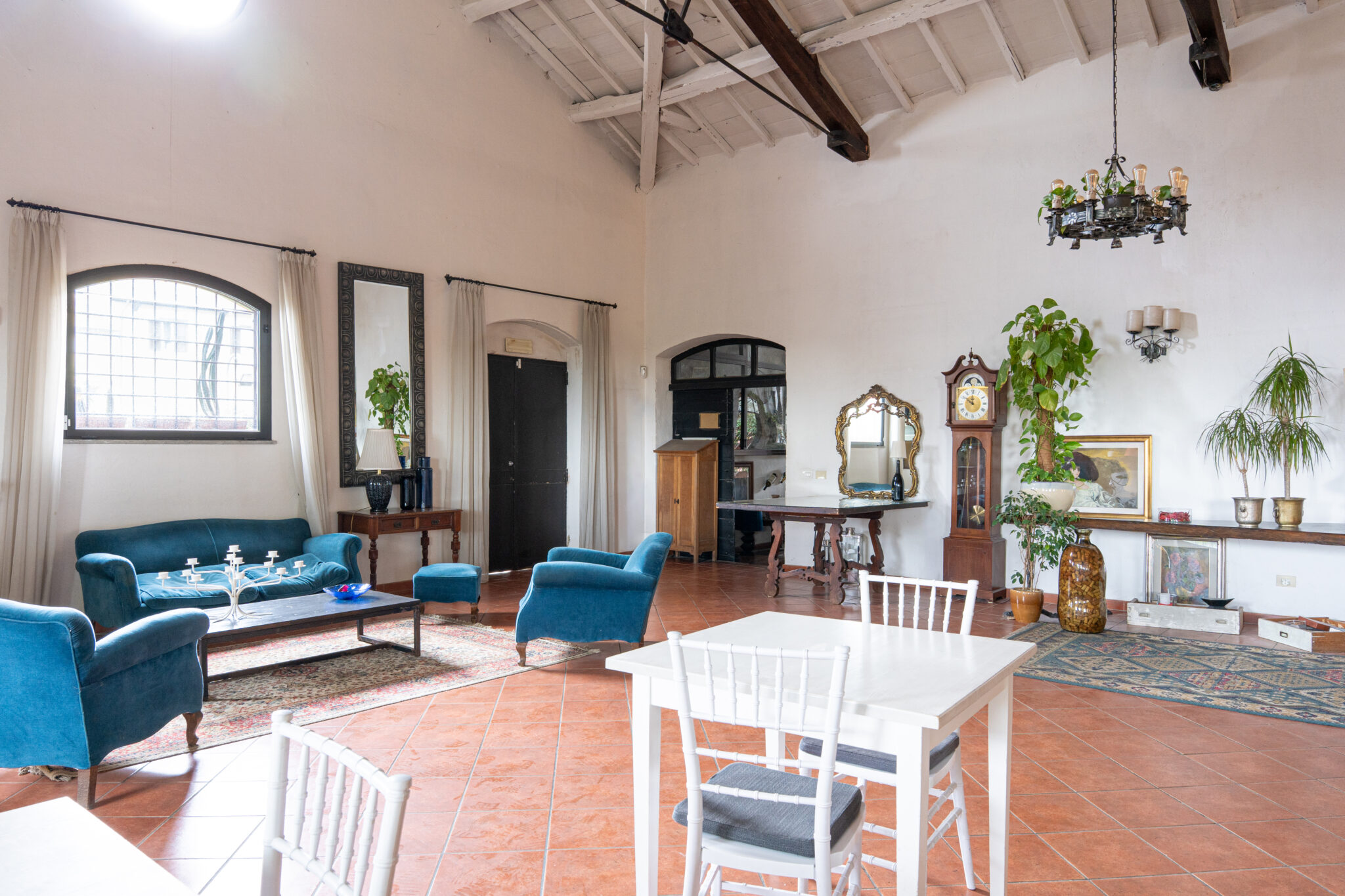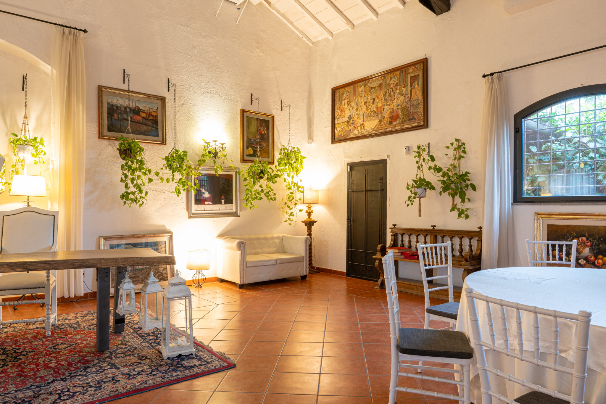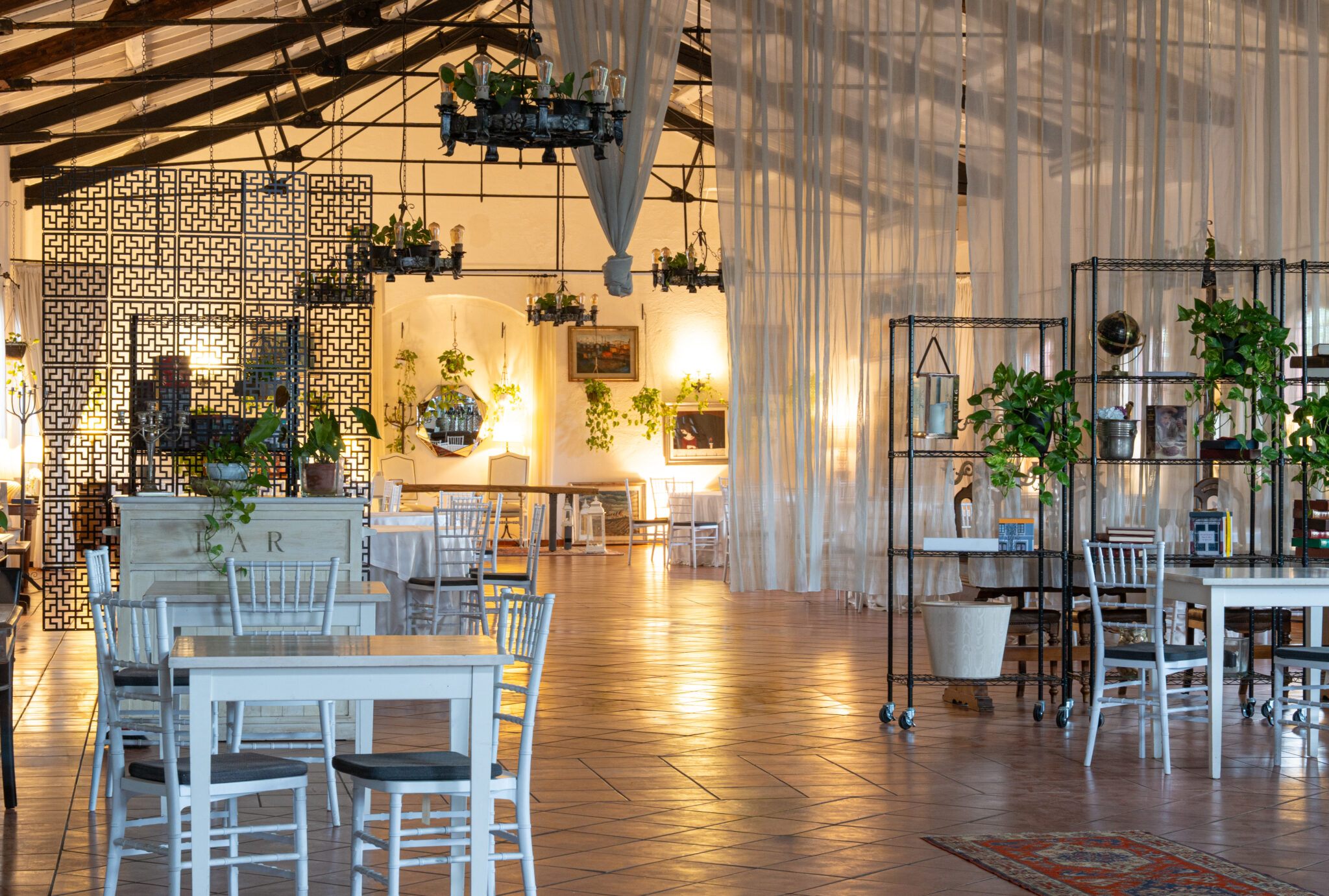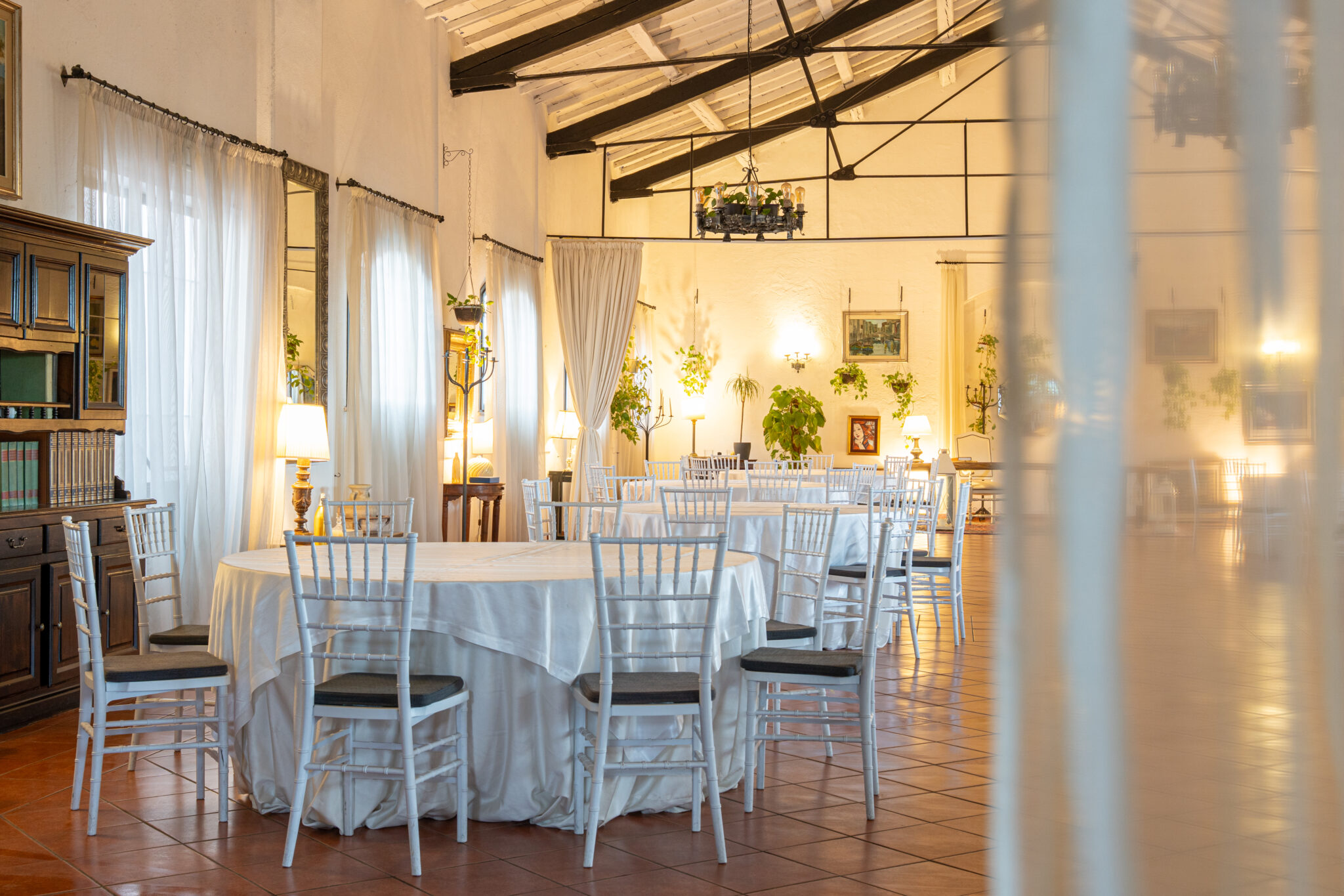Circa 500 mq di spazio interno caratterizzato da un ampio salone open space con soffitti alti e travi in legno a vista, grandi finestre ad arco che illuminano l’ambiente e una zona bar dedicata.