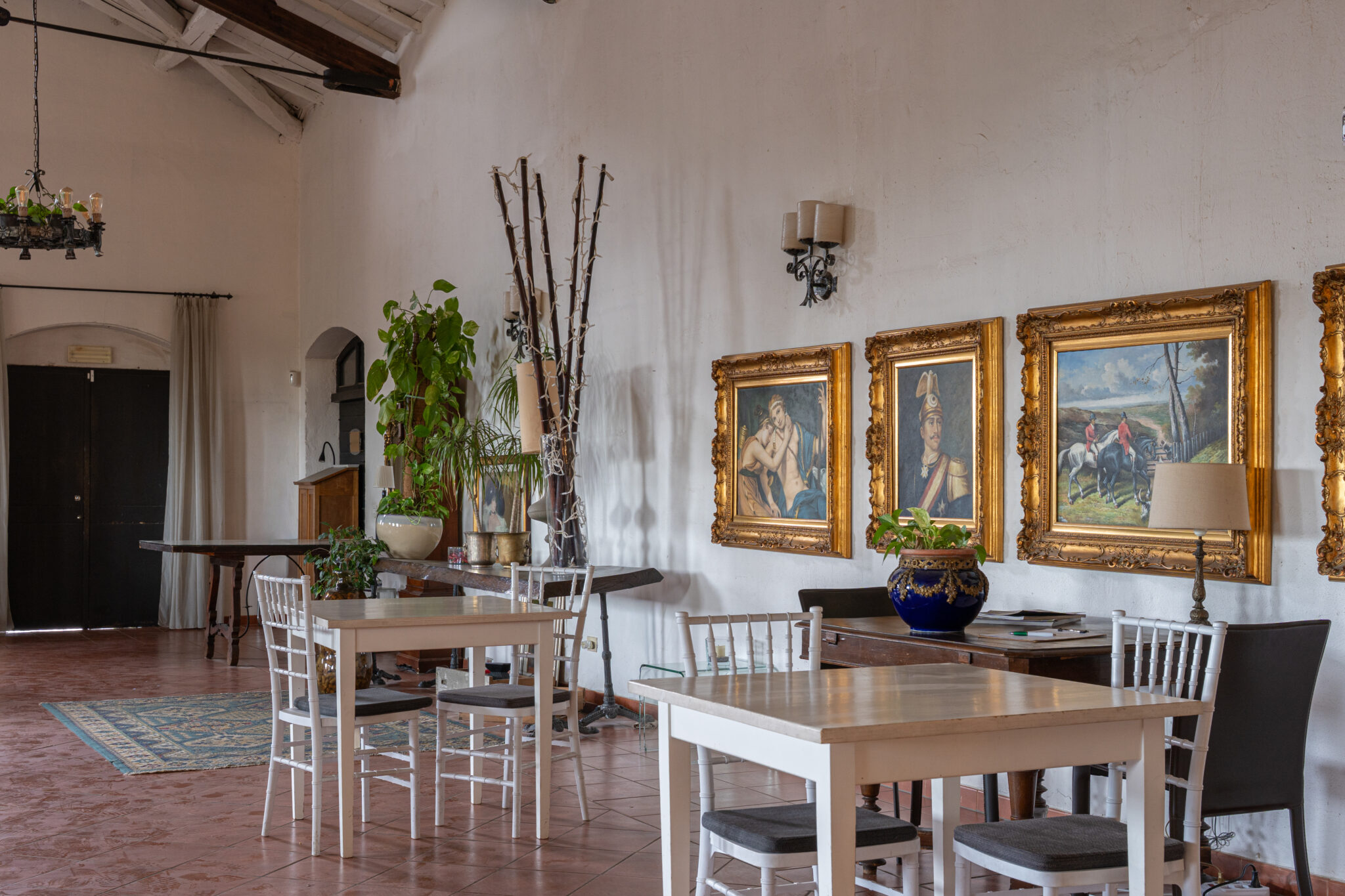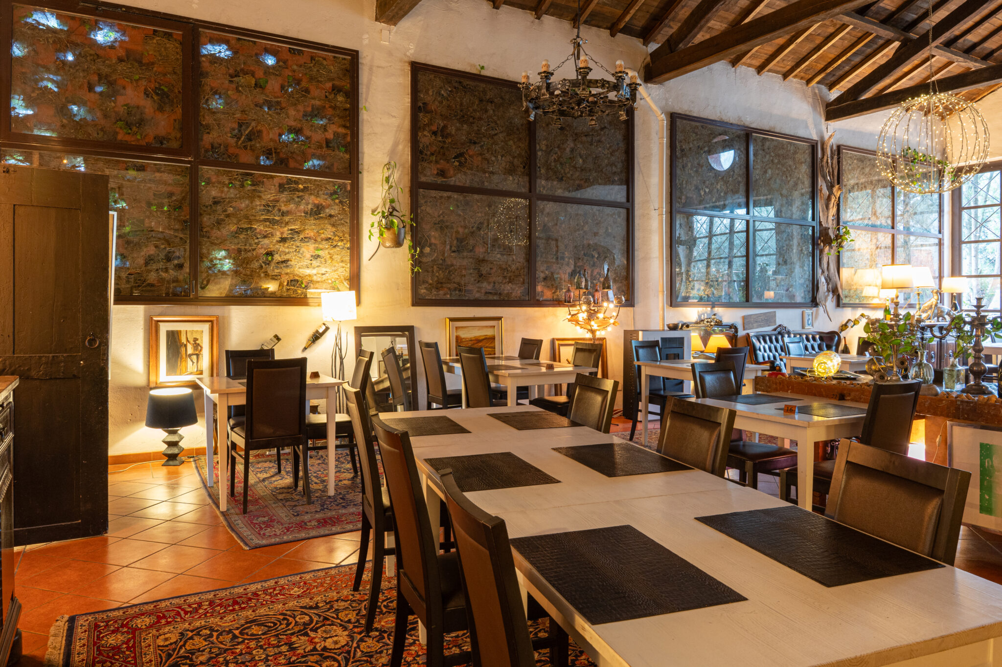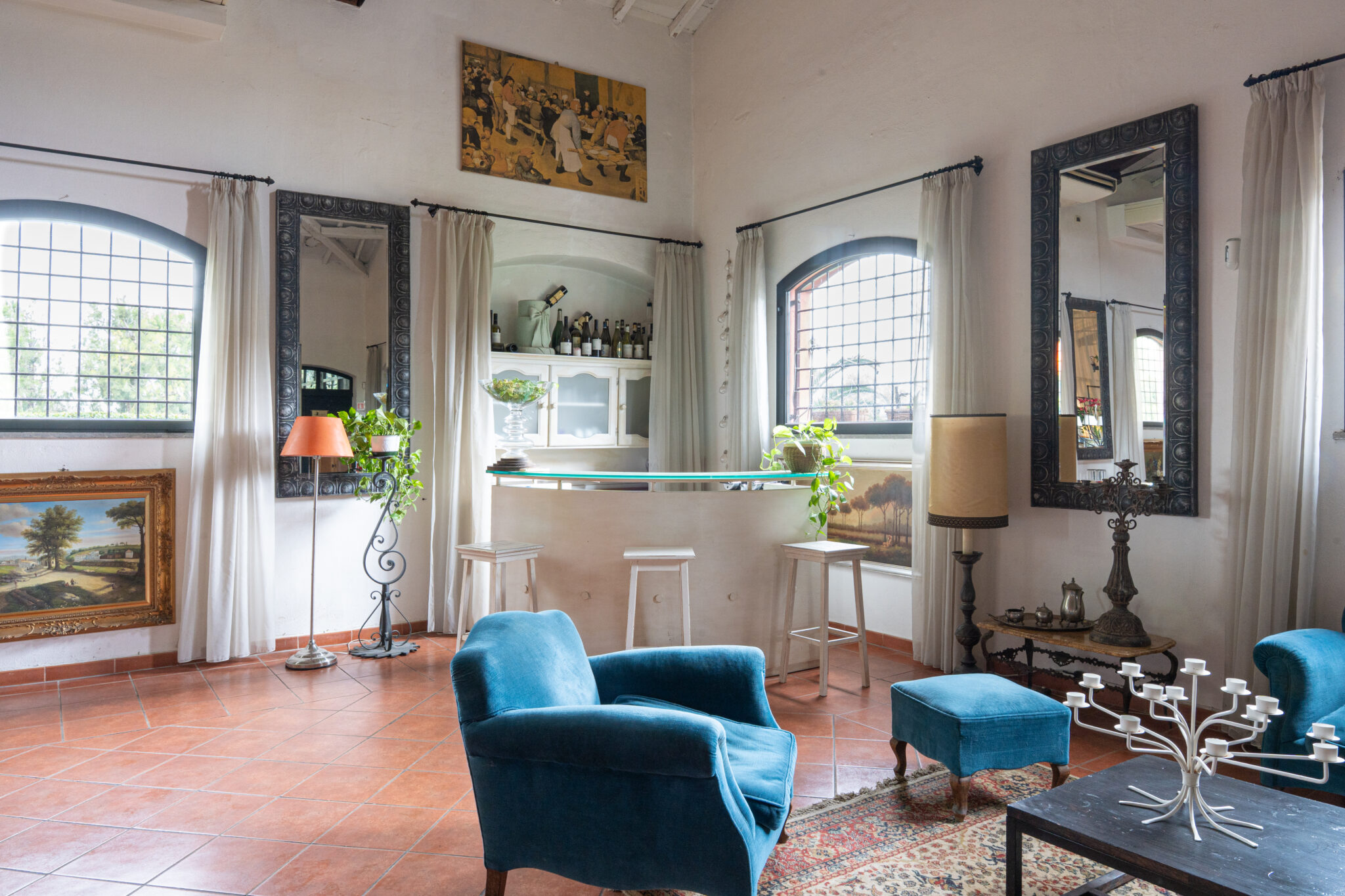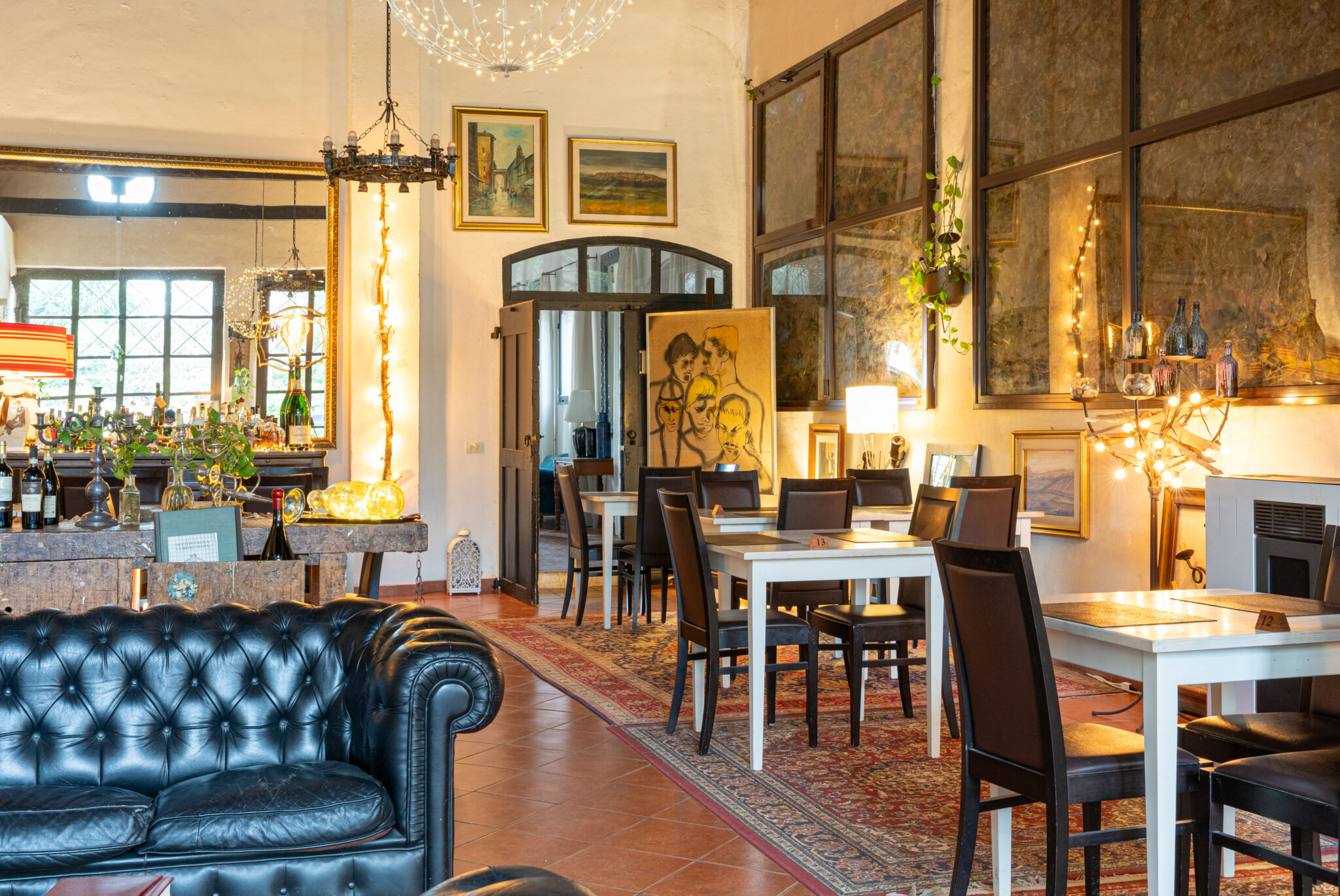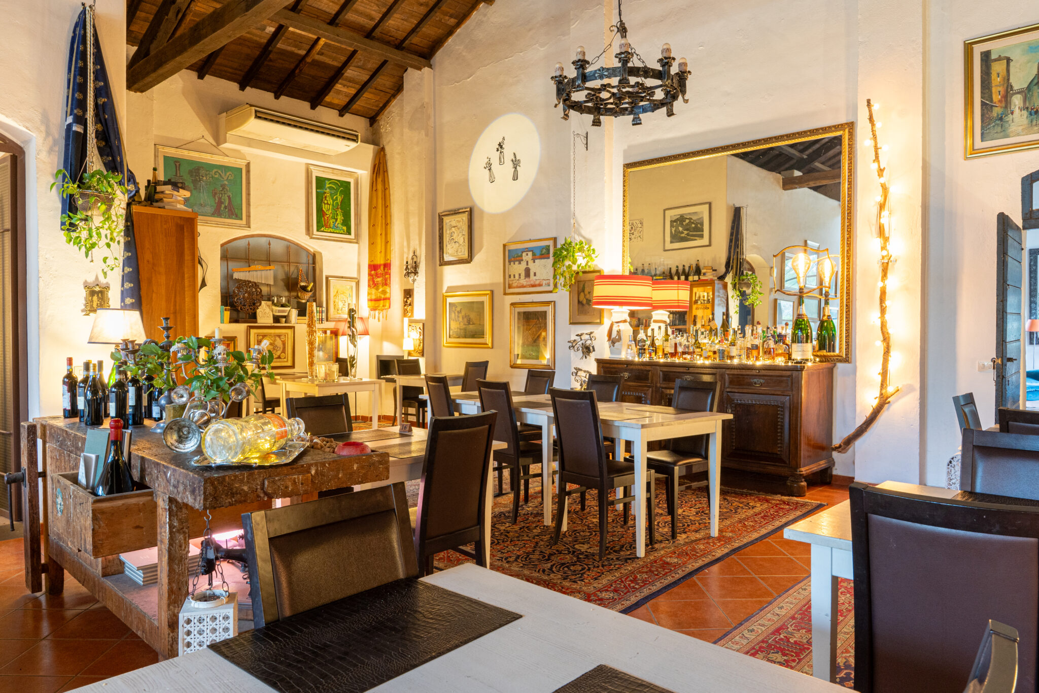 Circa 500 mq di spazio interno caratterizzato da un ampio salone open space con soffitti alti e travi in legno a vista, grandi finestre ad arco che illuminano l’ambiente e una zona bar dedicata.