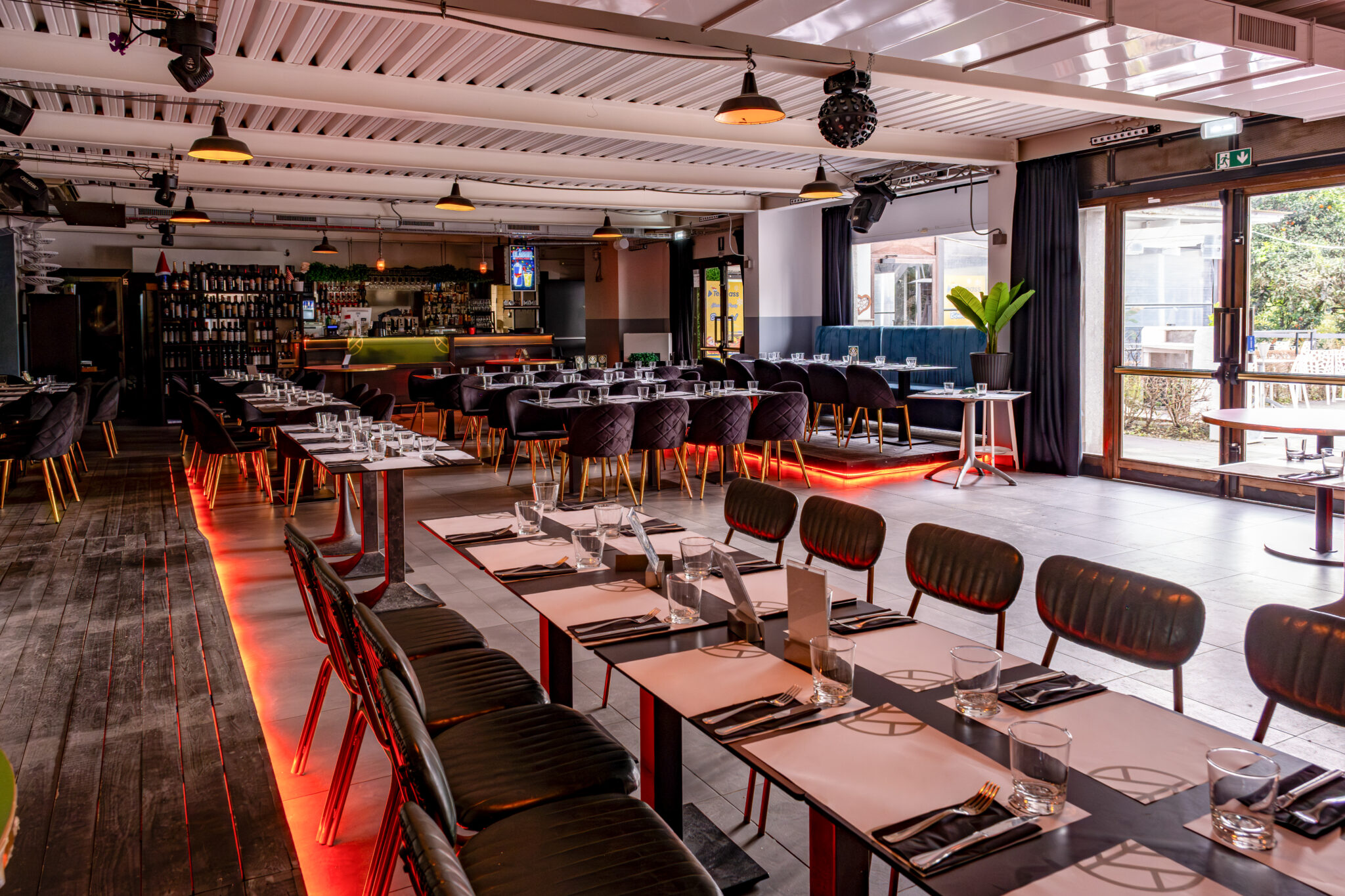 Spazio sviluppato su due livelli collegati internamente, con ambienti ampi e luminosi. Il piano inferiore presenta sale con soffitti alti e distribuzione regolare, mentre il livello superiore ospita un’area con travi in legno a vista e tavoli disposti su pianta aperta.