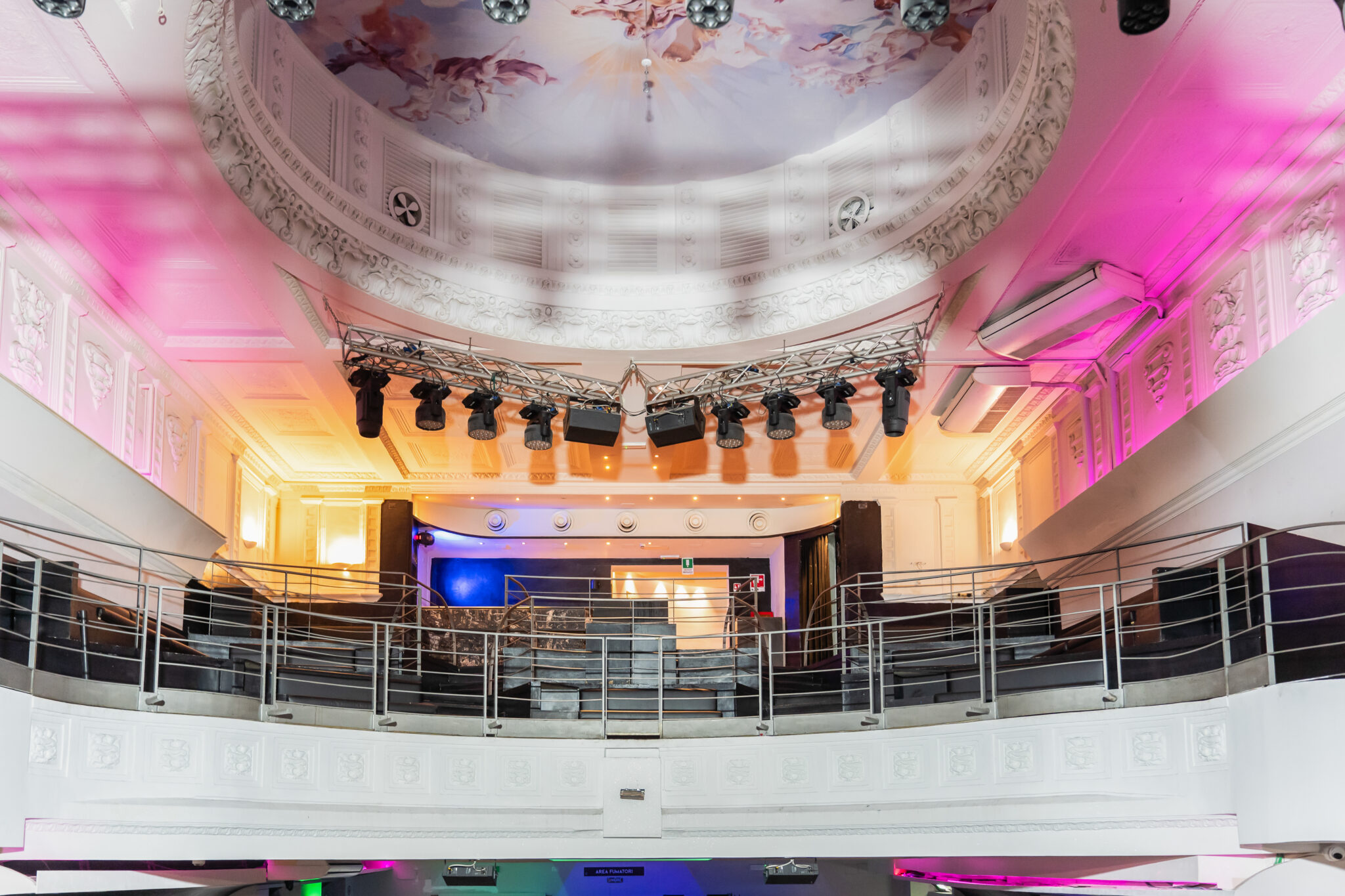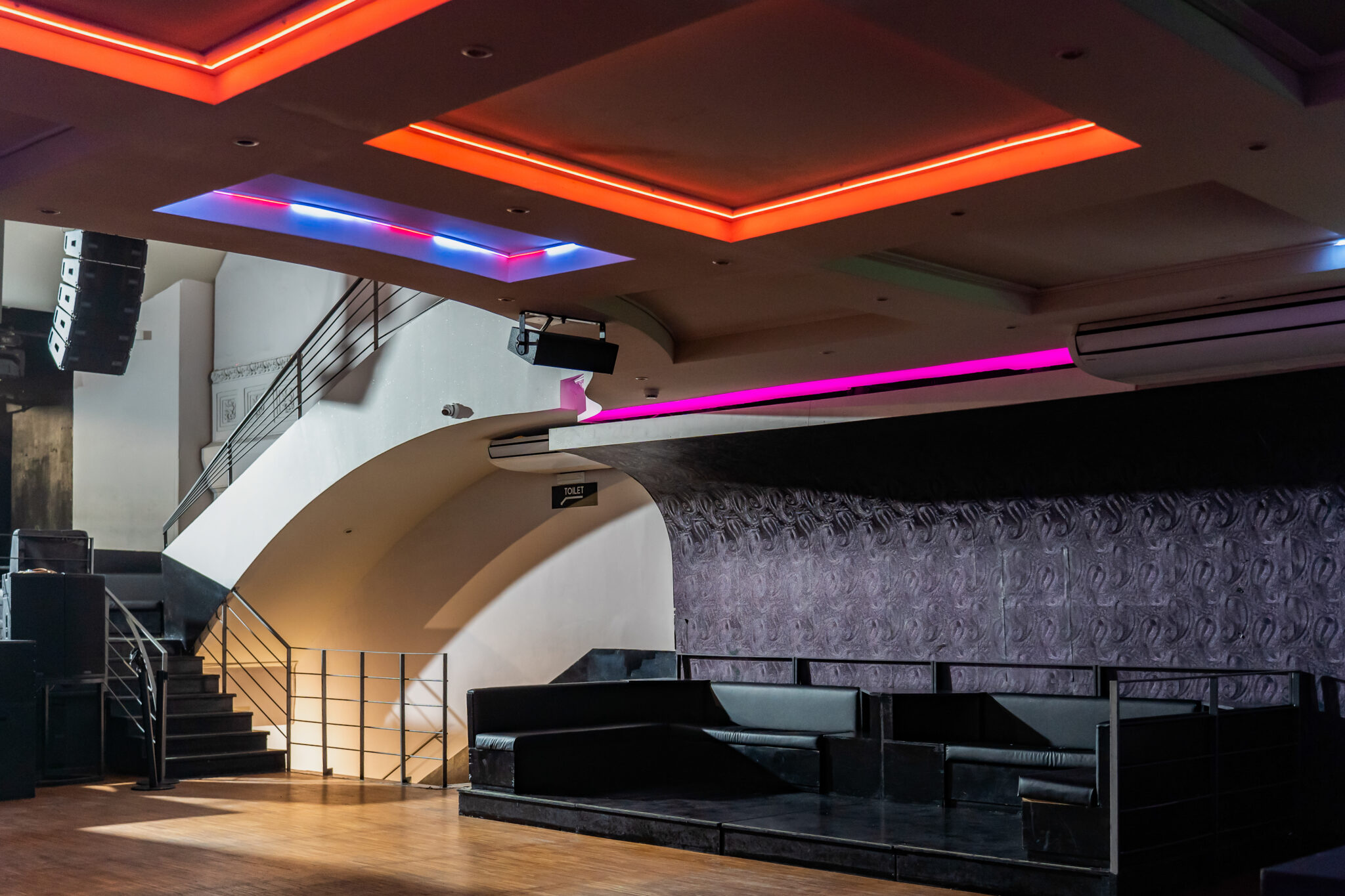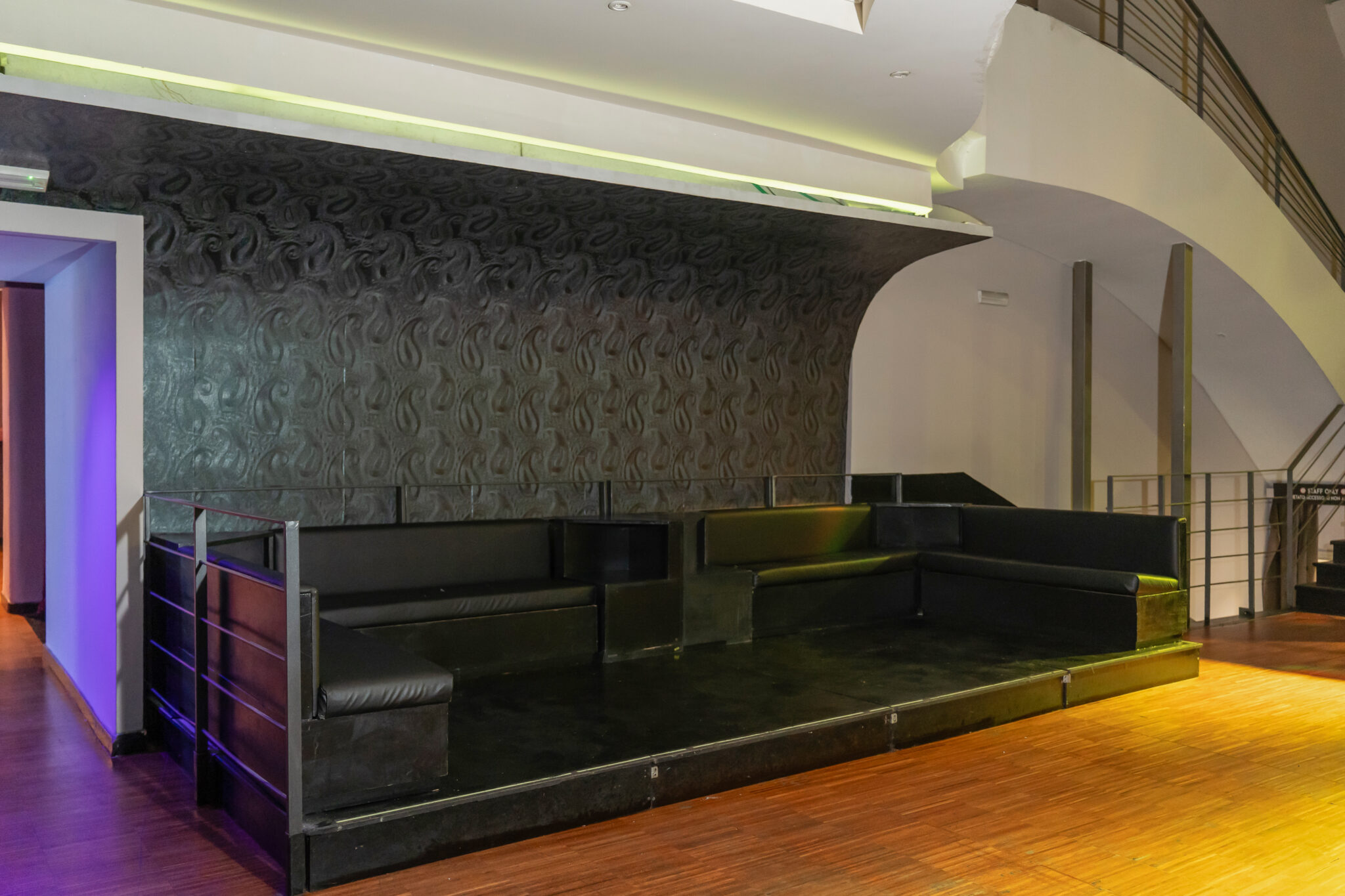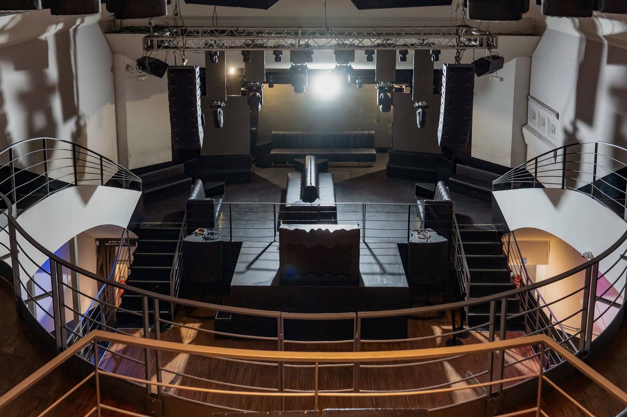 Più livelli e ambienti interconnessi che permettono di ospitare diverse tipologie di evento: platea centrale con divani modulari, balconata superiore affacciata sulla sala, aree lounge, bar scenografici e spazi di supporto. Un luogo dinamico, versatile e fortemente identitario, pensato per eventi, performance, party e produzioni creative.