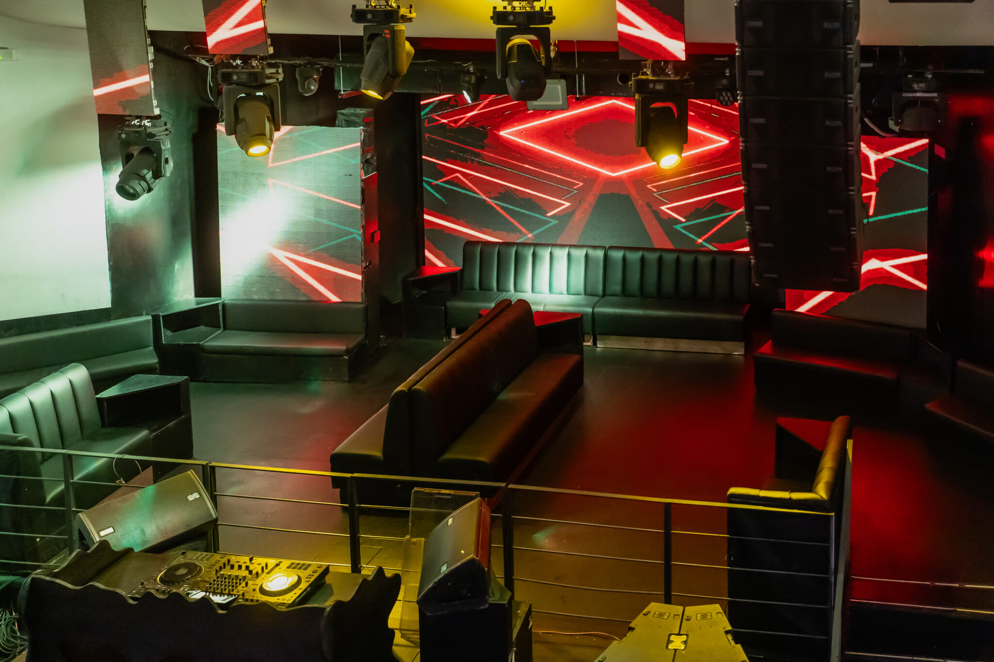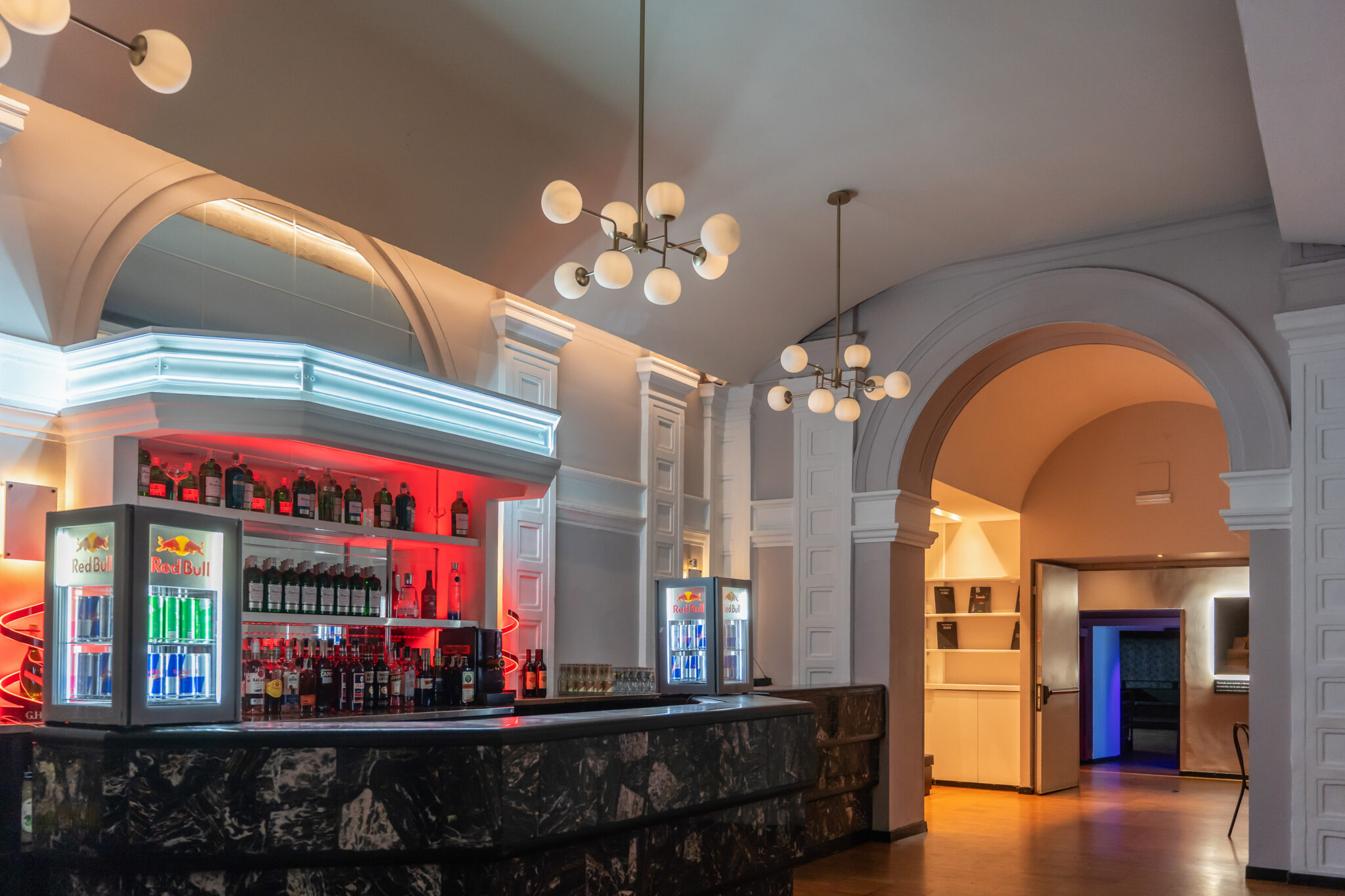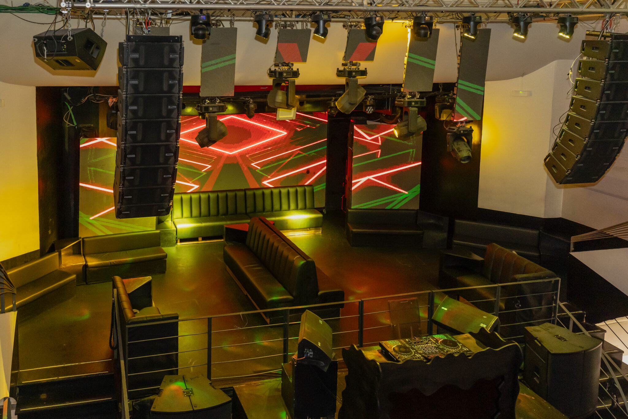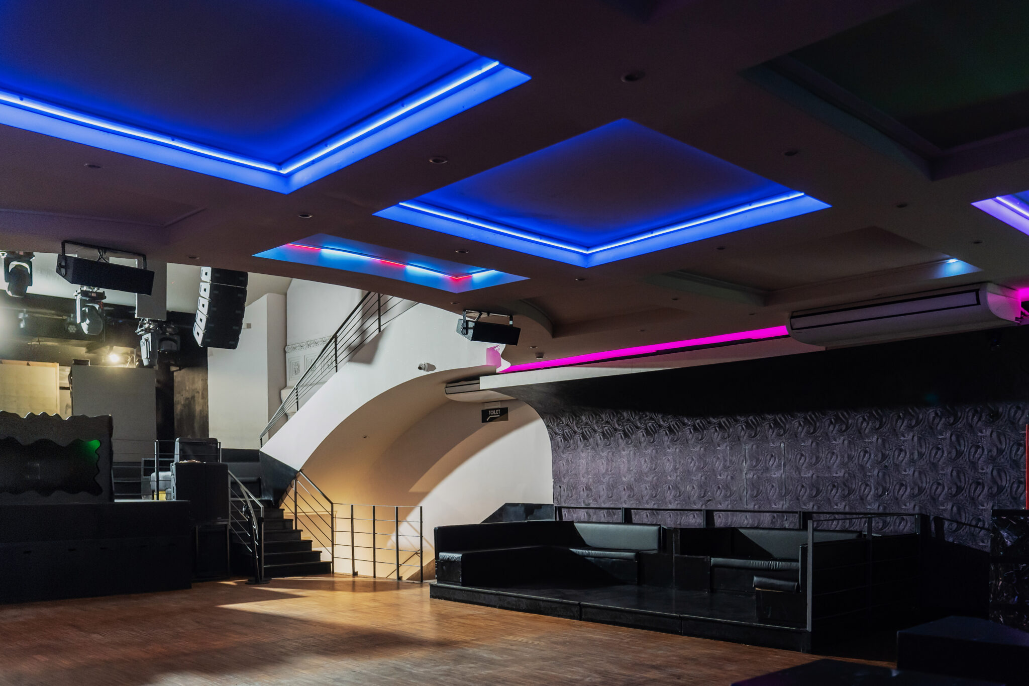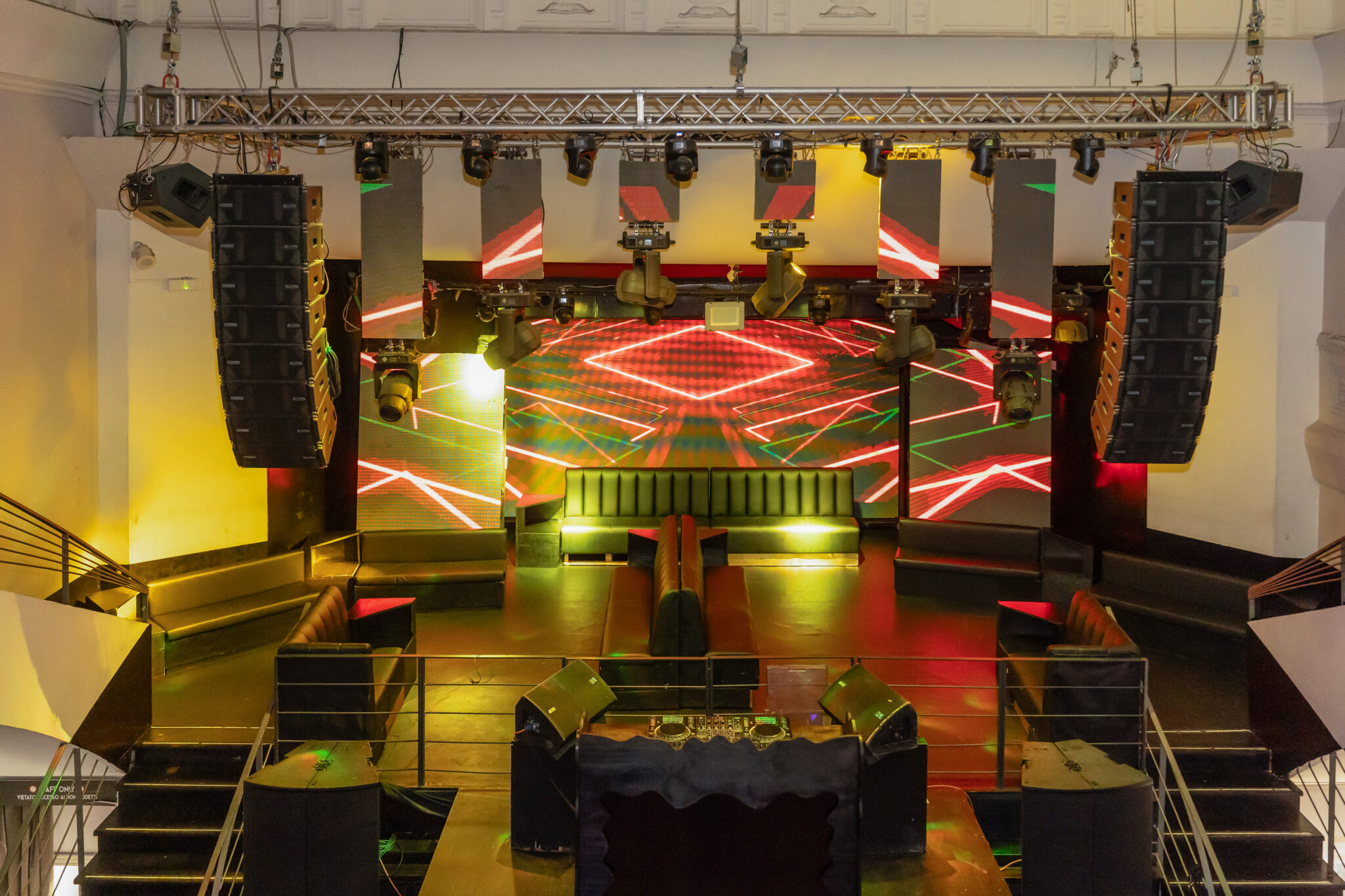Più livelli e ambienti interconnessi che permettono di ospitare diverse tipologie di evento: platea centrale con divani modulari, balconata superiore affacciata sulla sala, aree lounge, bar scenografici e spazi di supporto. Un luogo dinamico, versatile e fortemente identitario, pensato per eventi, performance, party e produzioni creative.