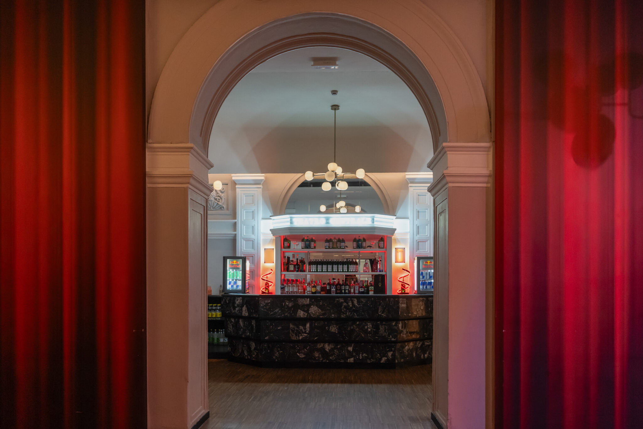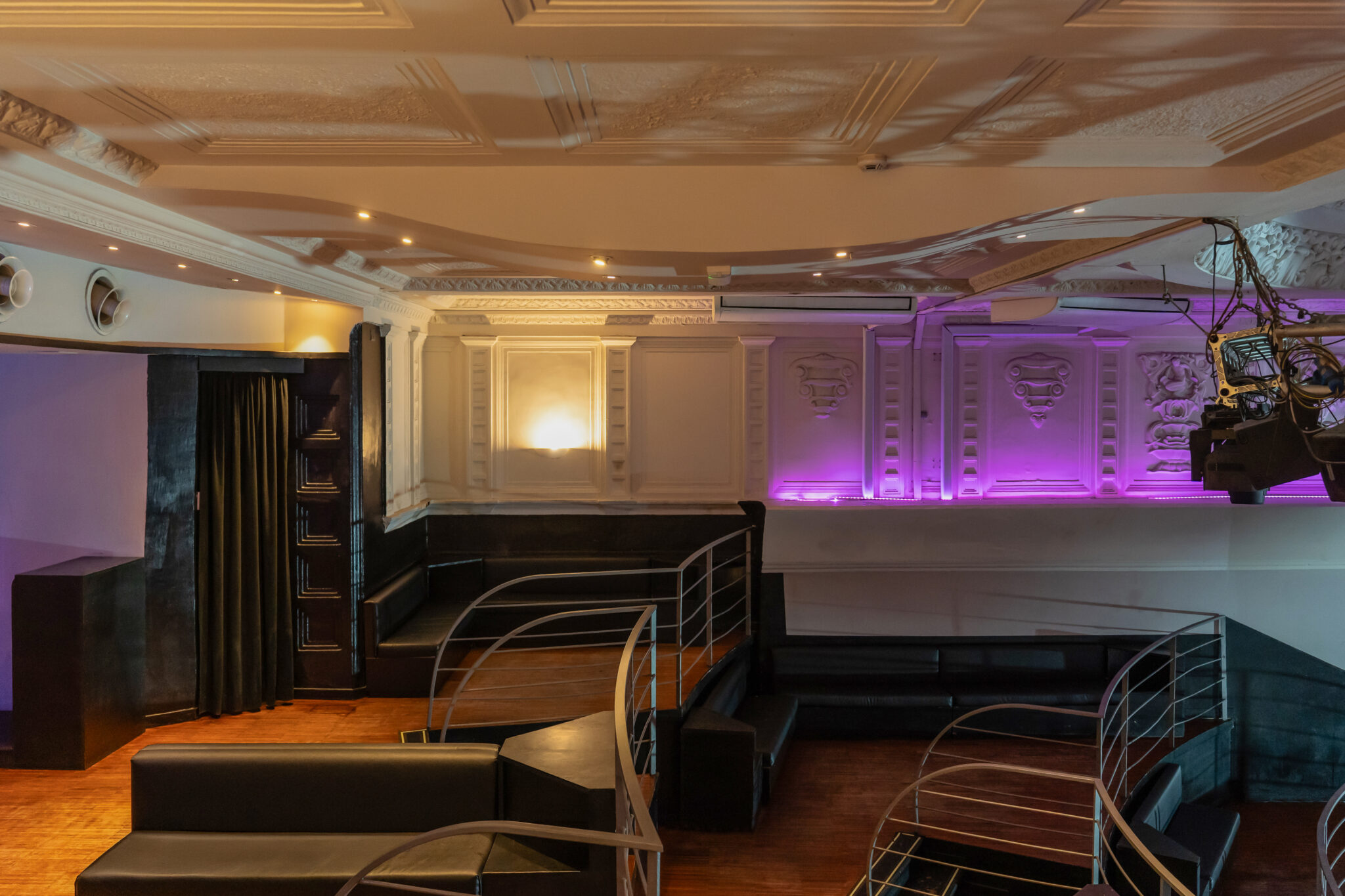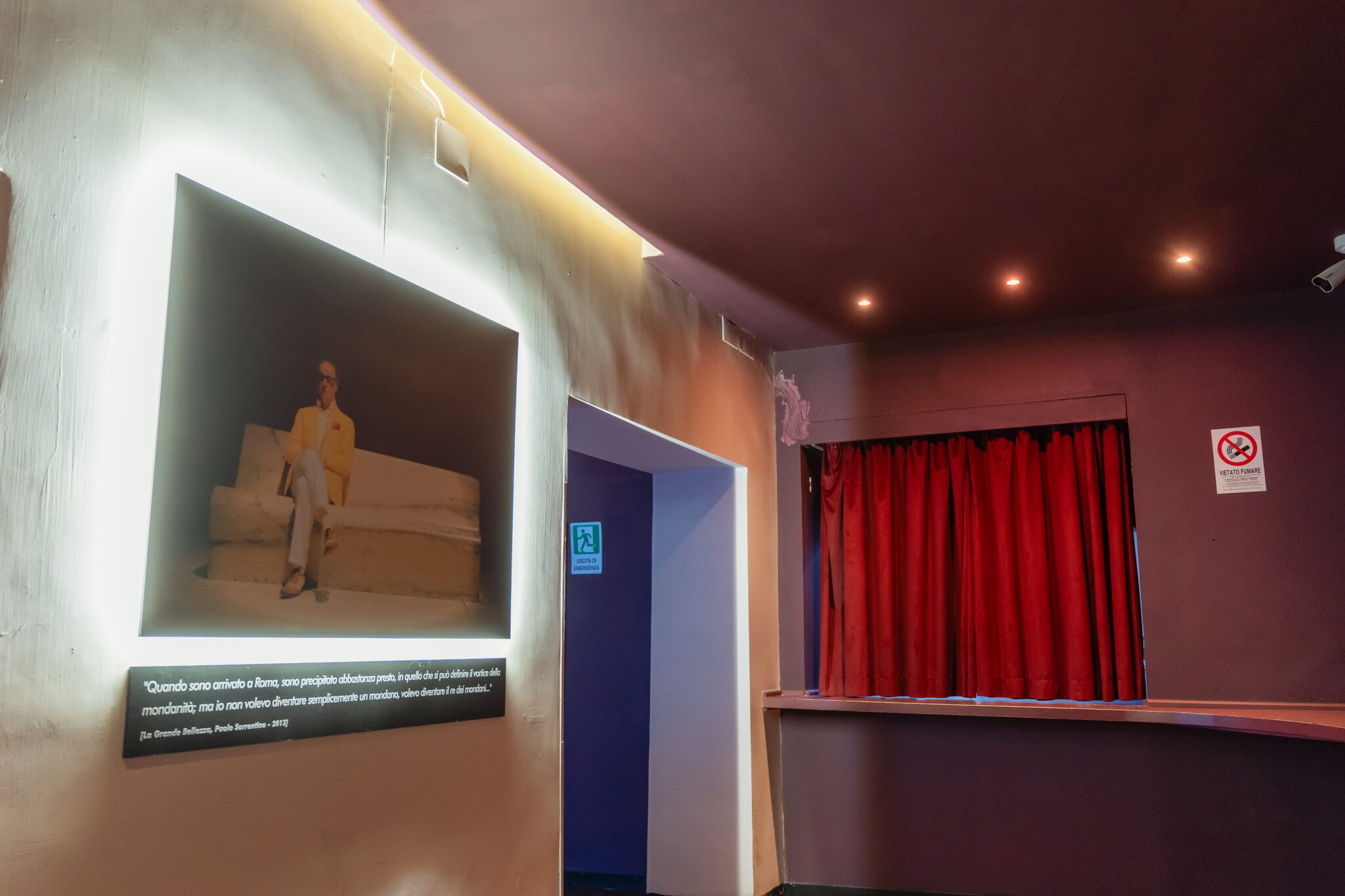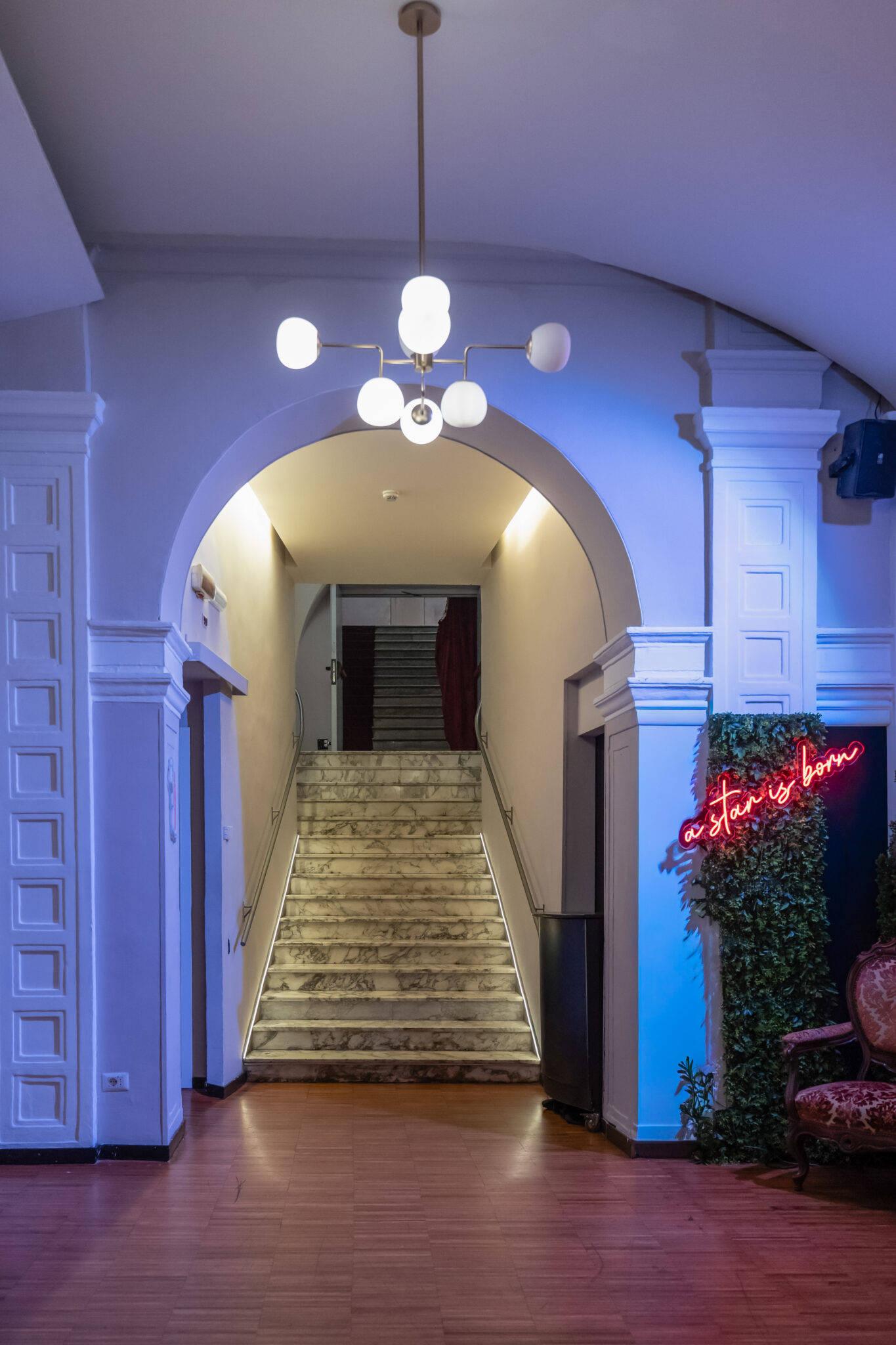 Più livelli e ambienti interconnessi che permettono di ospitare diverse tipologie di evento: platea centrale con divani modulari, balconata superiore affacciata sulla sala, aree lounge, bar scenografici e spazi di supporto. Un luogo dinamico, versatile e fortemente identitario, pensato per eventi, performance, party e produzioni creative.