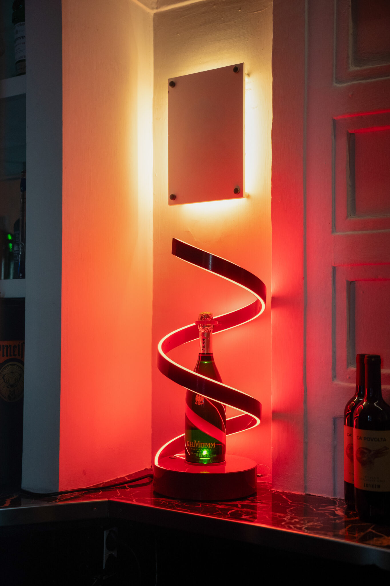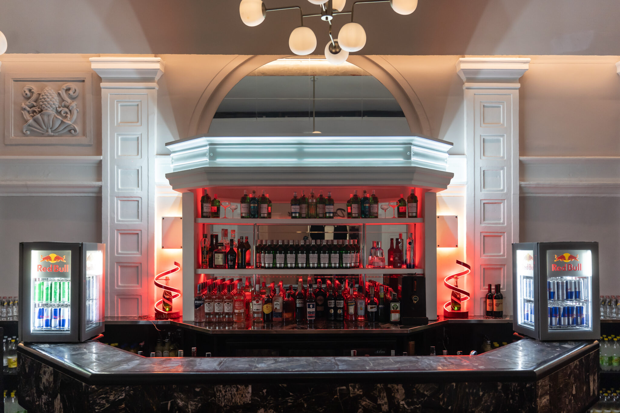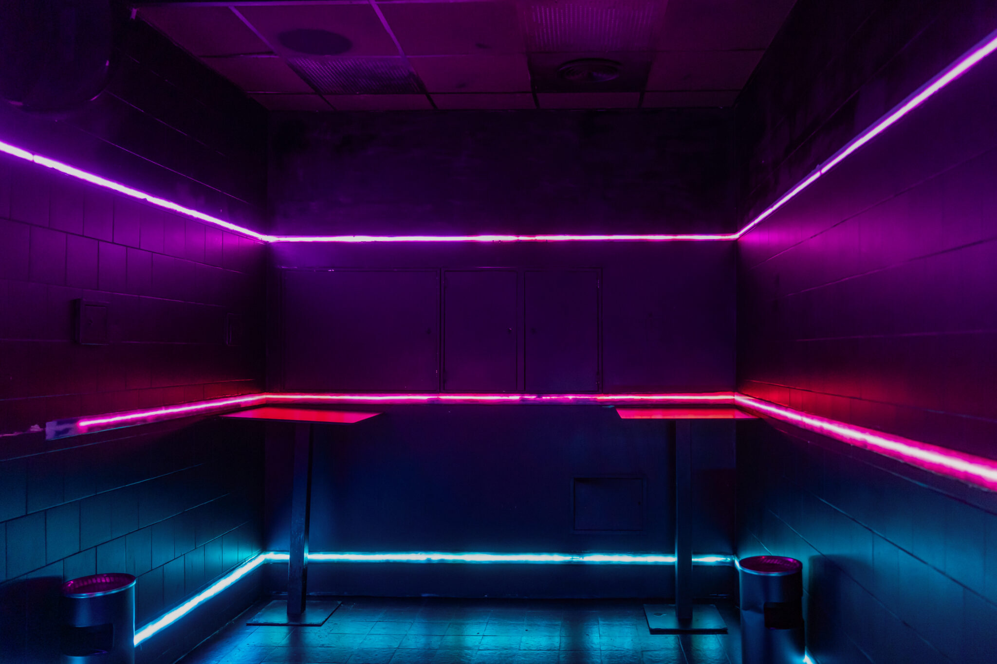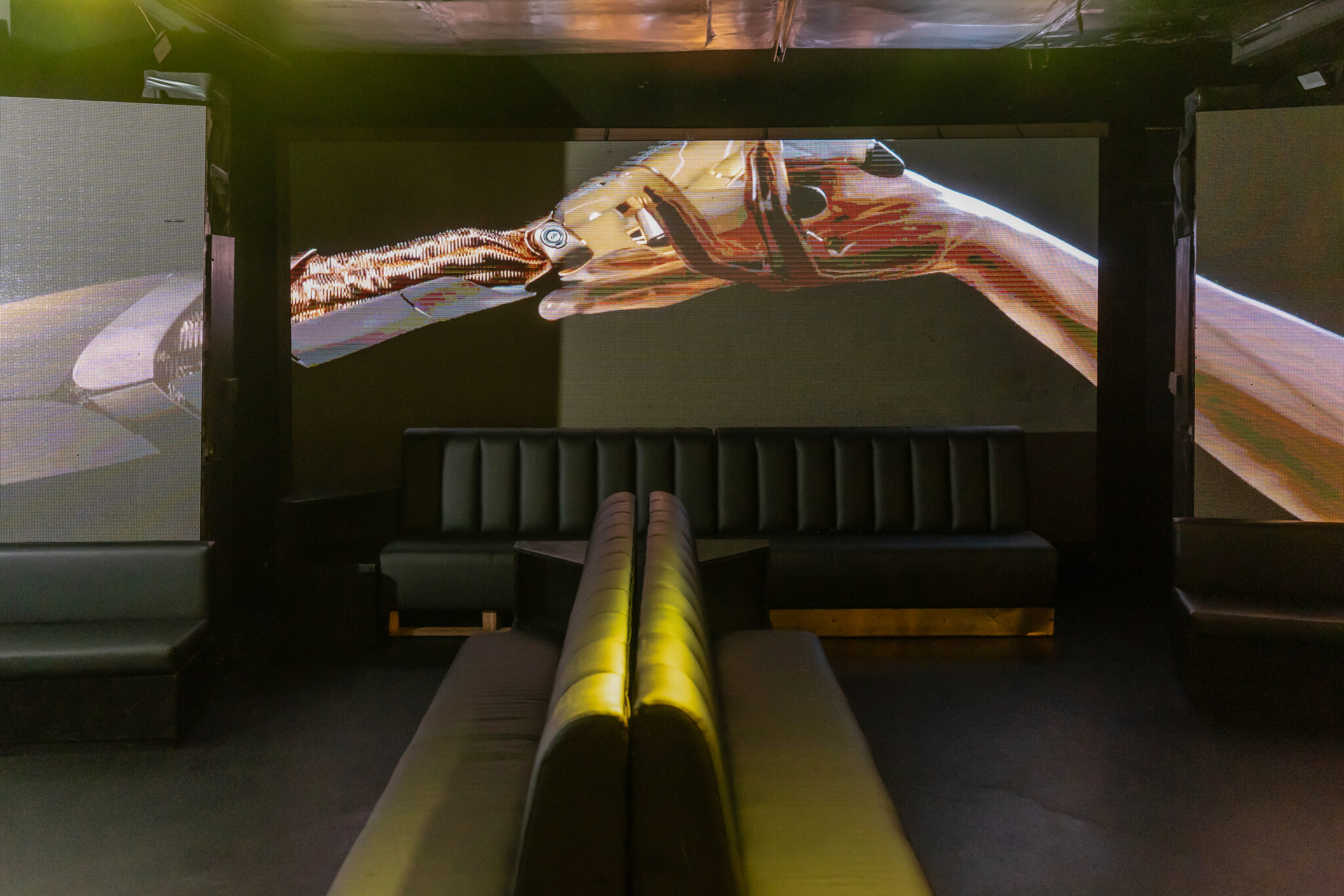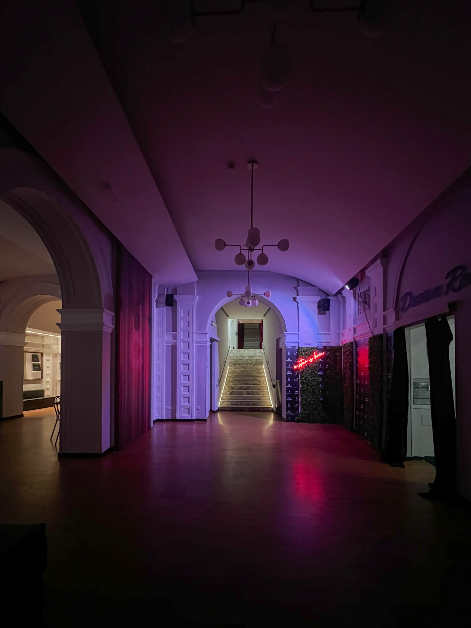 Più livelli e ambienti interconnessi che permettono di ospitare diverse tipologie di evento: platea centrale con divani modulari, balconata superiore affacciata sulla sala, aree lounge, bar scenografici e spazi di supporto. Un luogo dinamico, versatile e fortemente identitario, pensato per eventi, performance, party e produzioni creative.