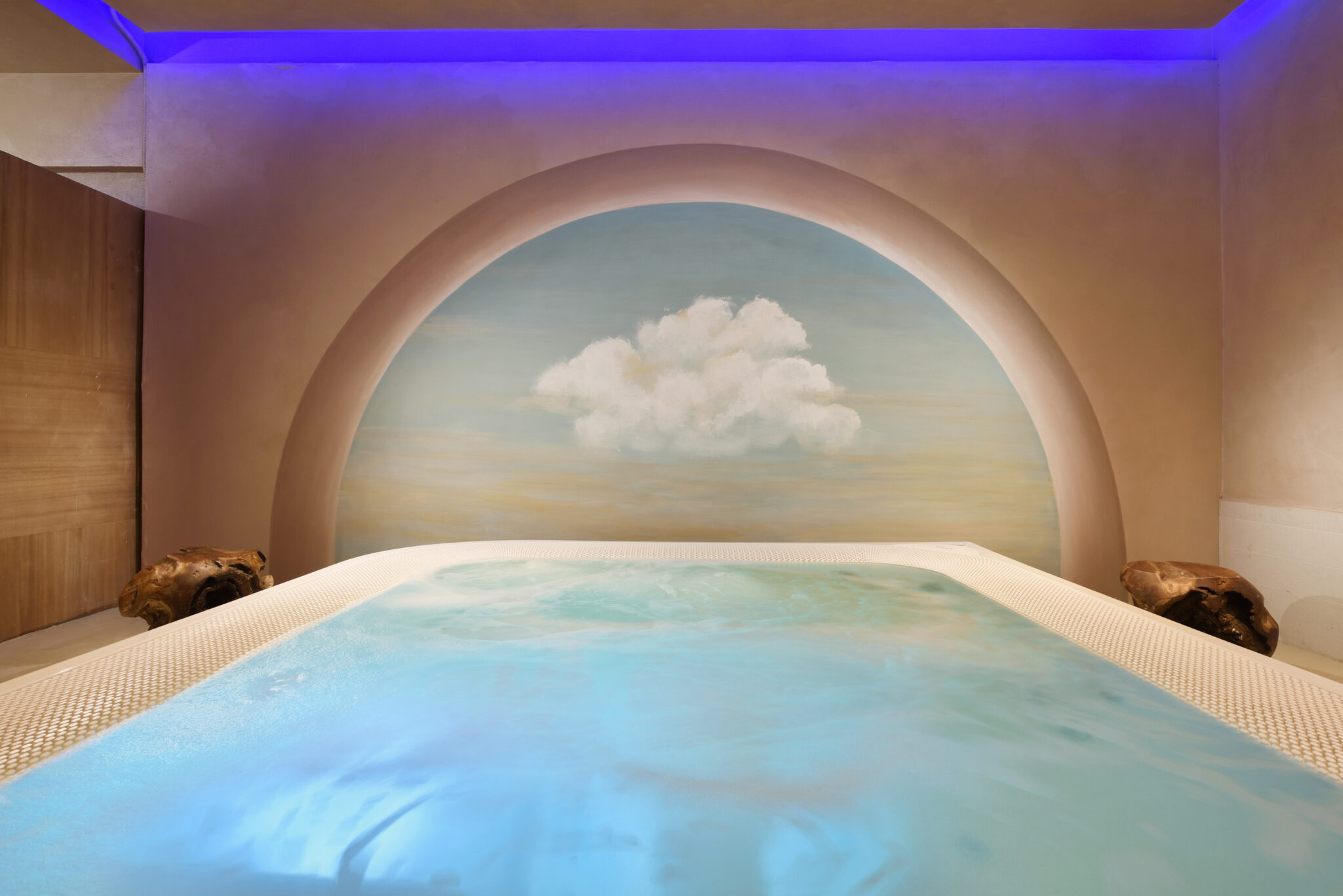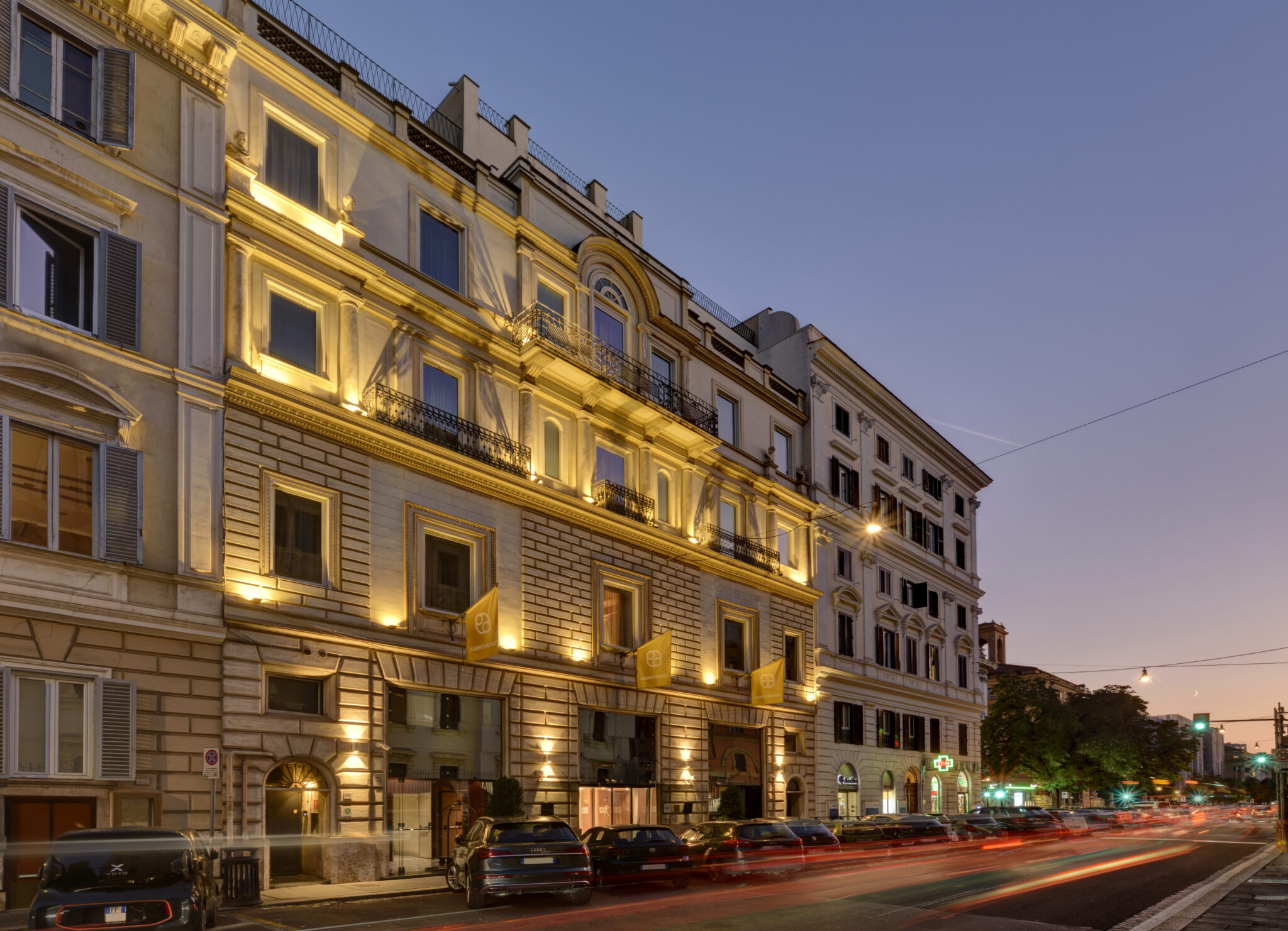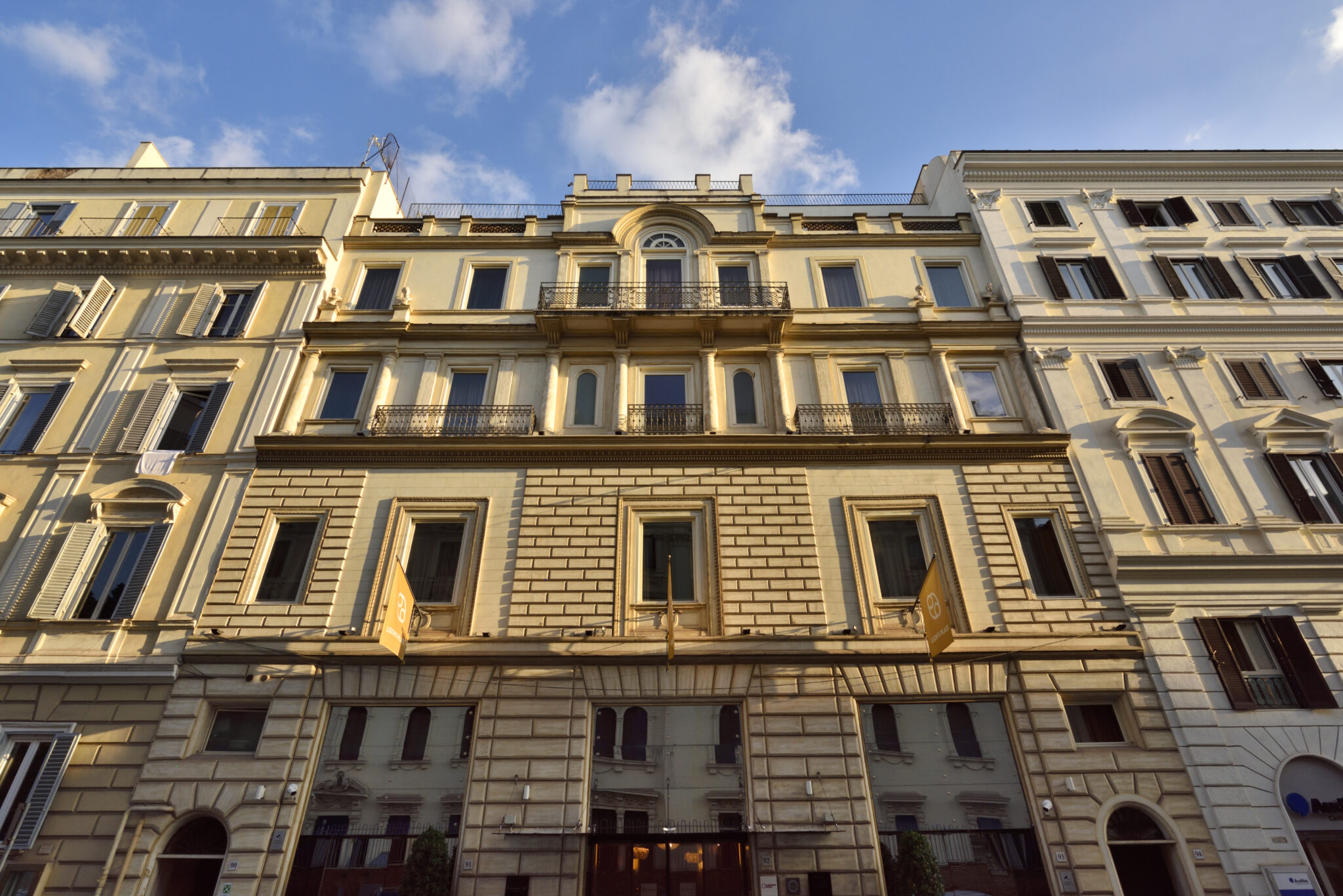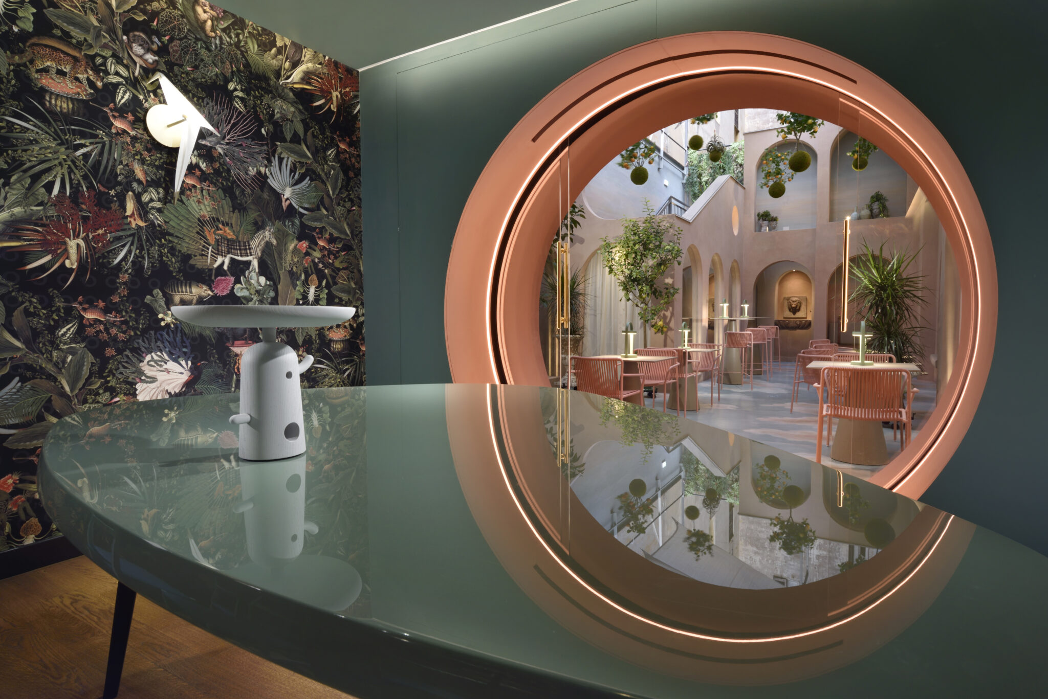 Location che unisce il fascino di un palazzo storico a un interior design contemporaneo, con ingresso monumentale, colonne classiche e pavimentazioni in marmo decorato. Gli ambienti si sviluppano tra saloni simmetrici e una corte interna a doppia altezza definita da archi e affacci superiori.