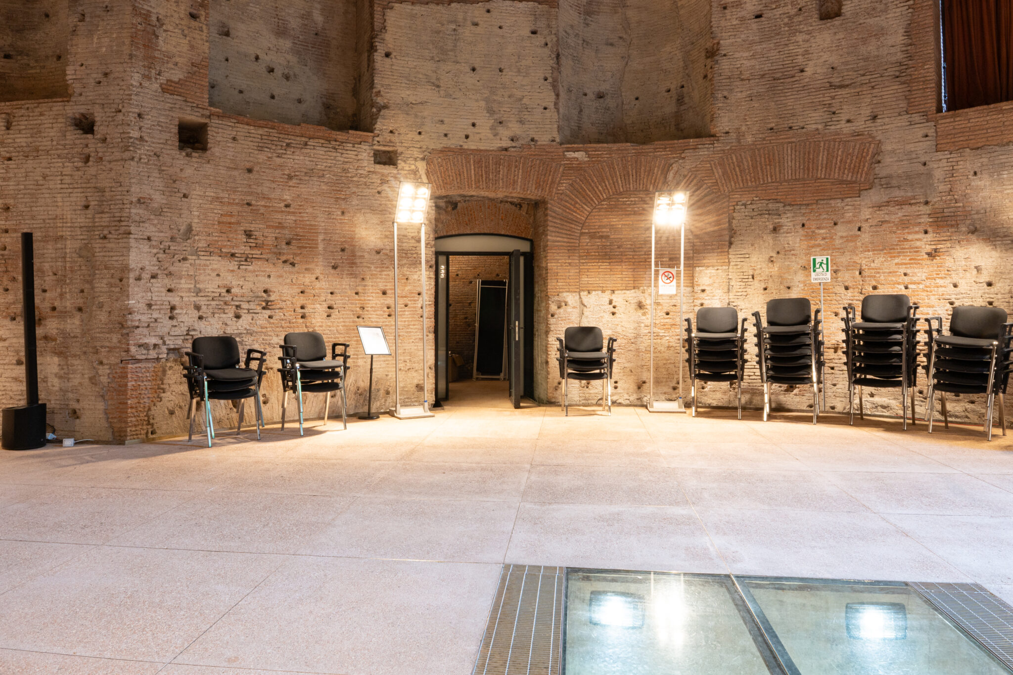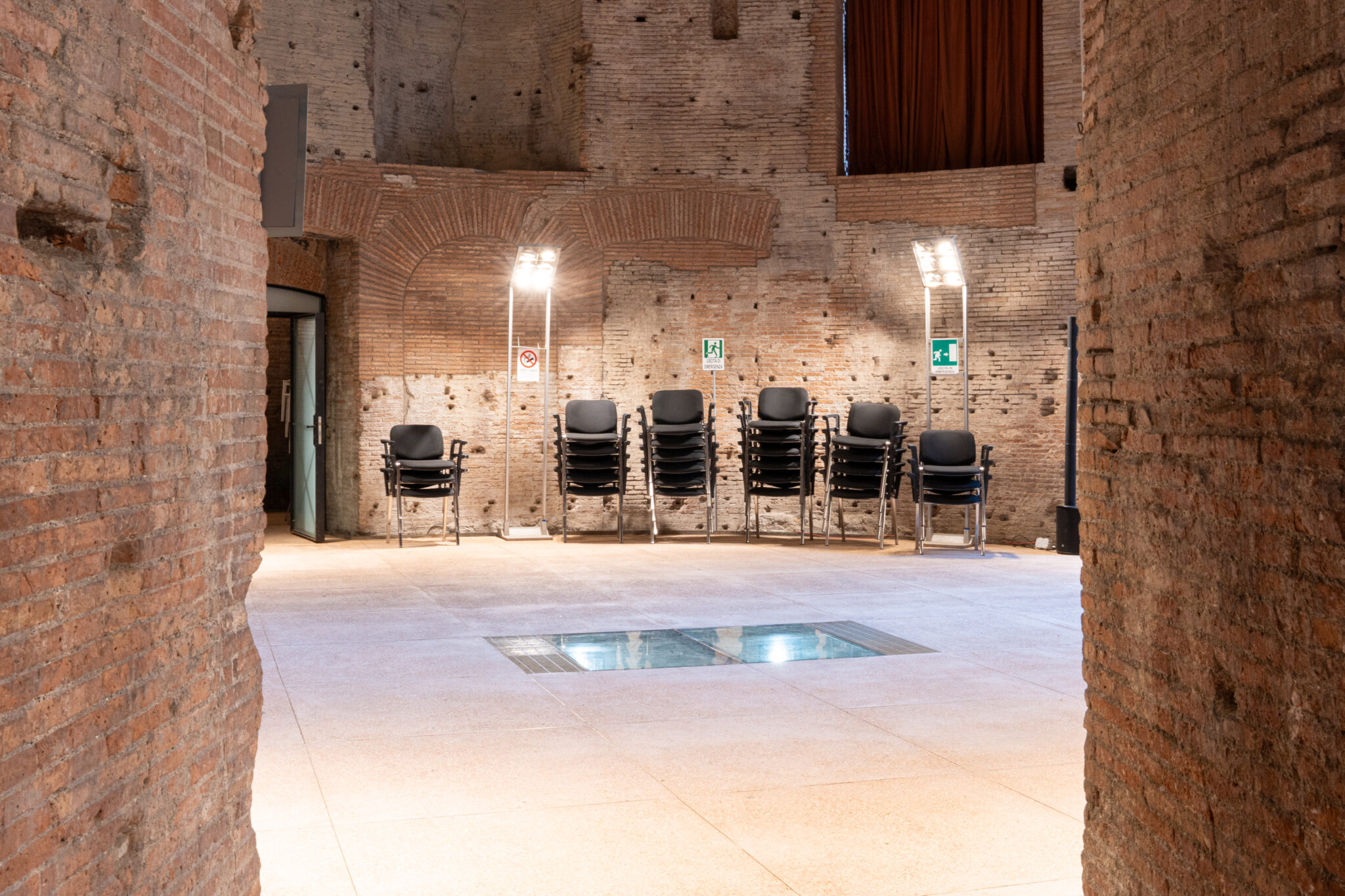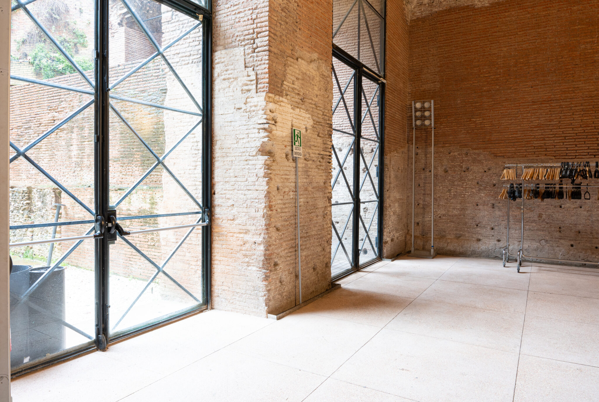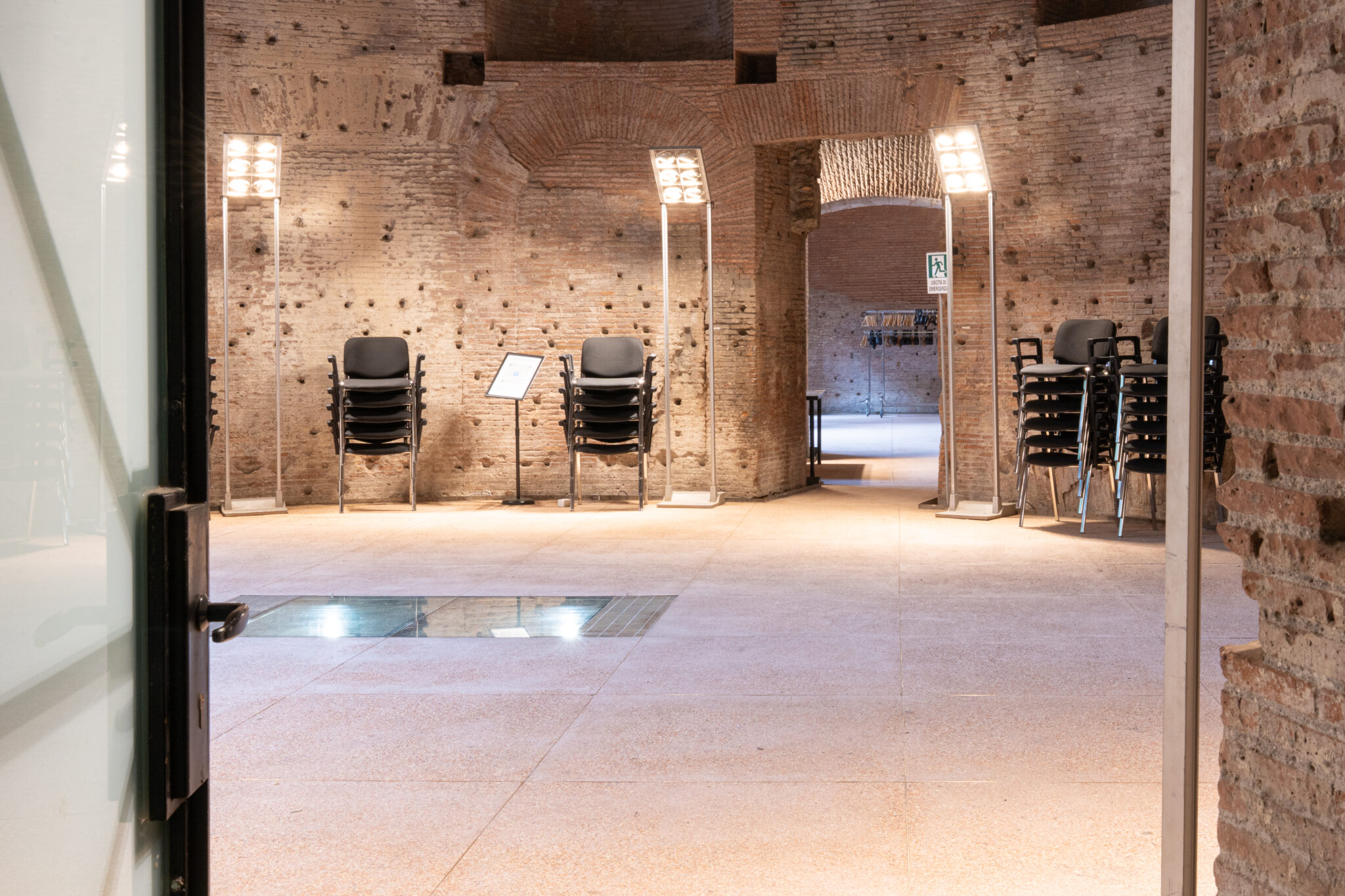 Circa 220 mq di spazio interno suddiviso in più ambienti principali adatti a diverse configurazioni di allestimento.