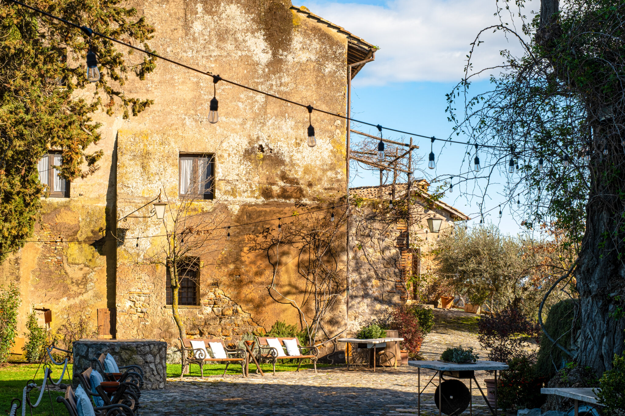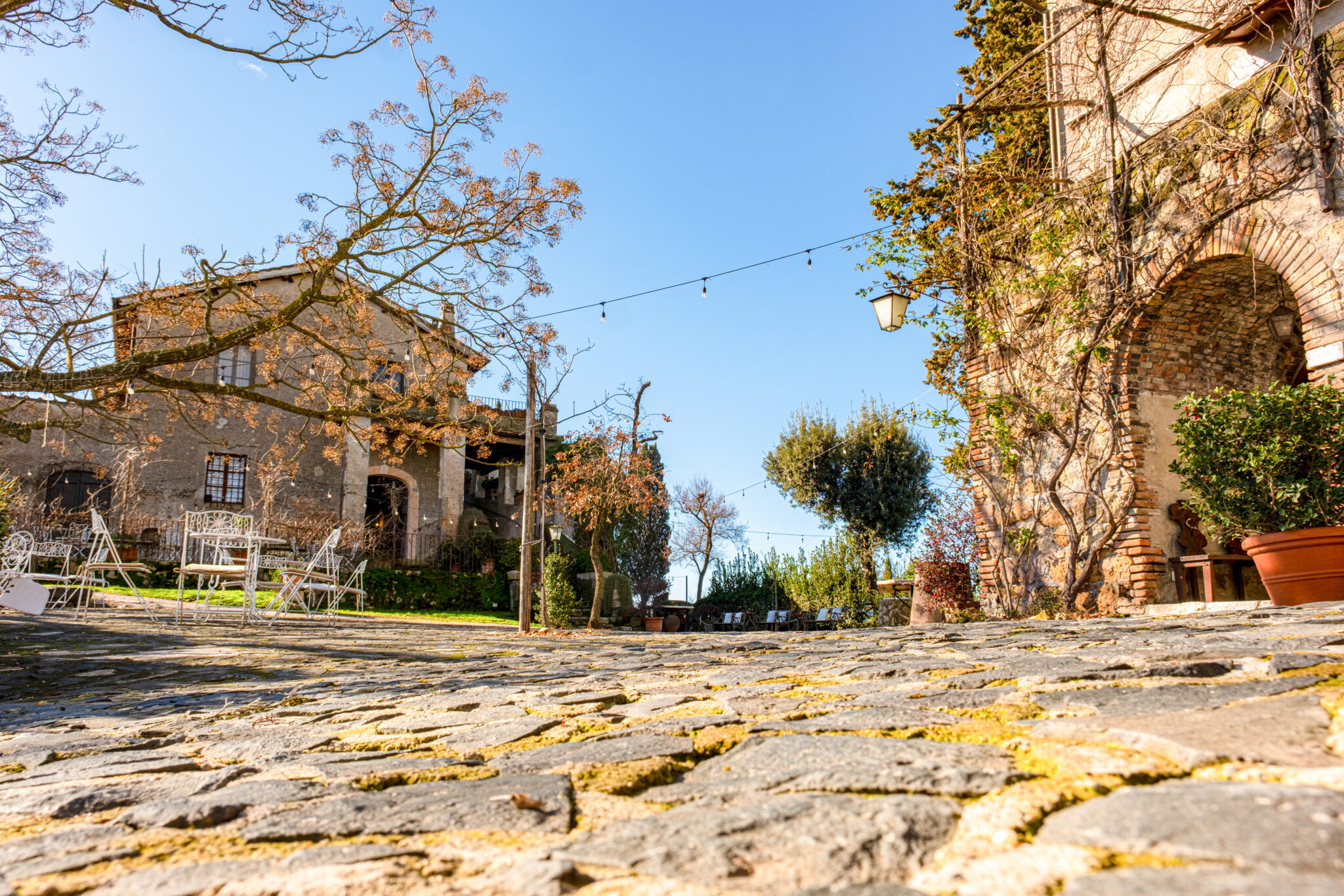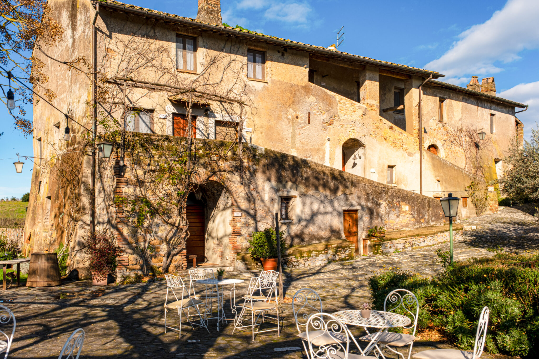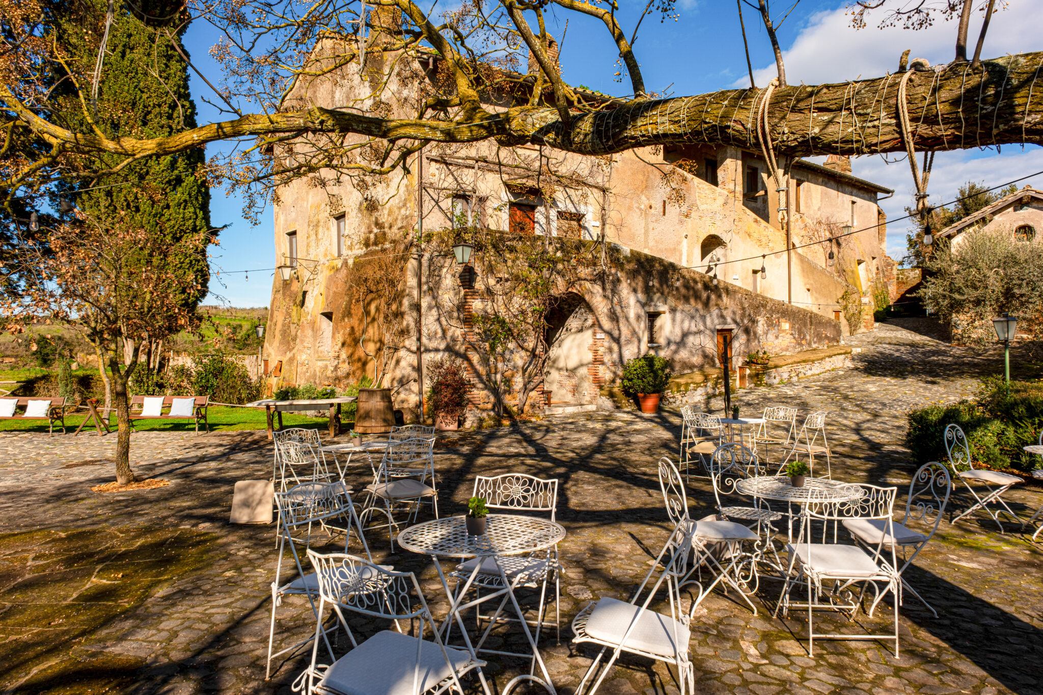 Il complesso si sviluppa all’interno di un contesto di casali e corti in pietra con giardini e terrazze affacciate sul paesaggio circostante, offrendo un’atmosfera autentica e suggestiva per eventi in ogni stagione.