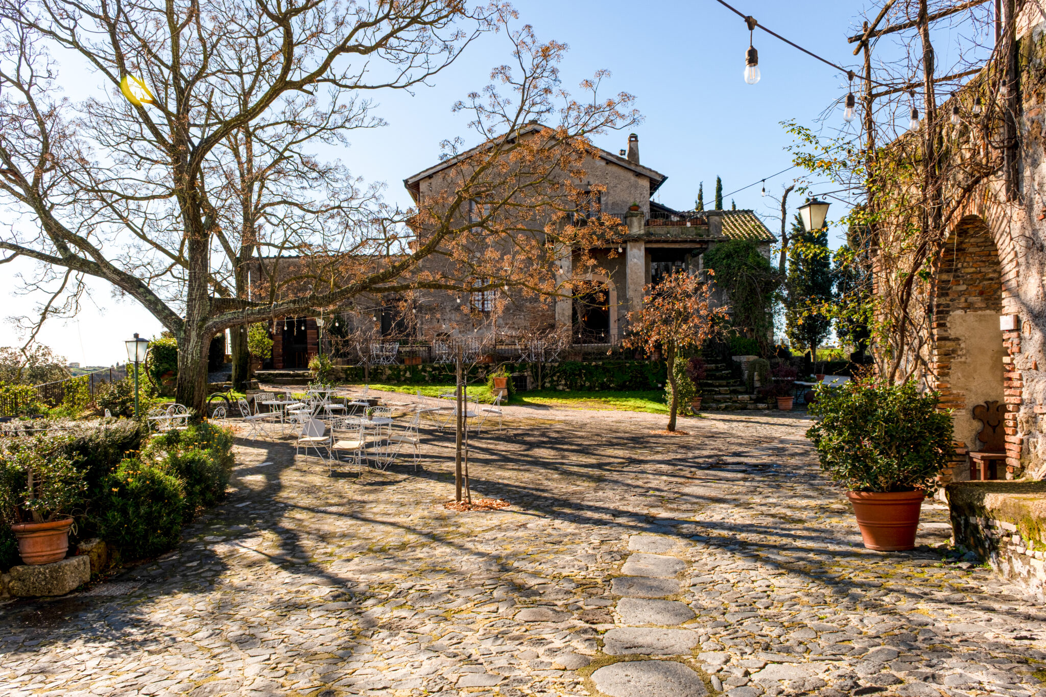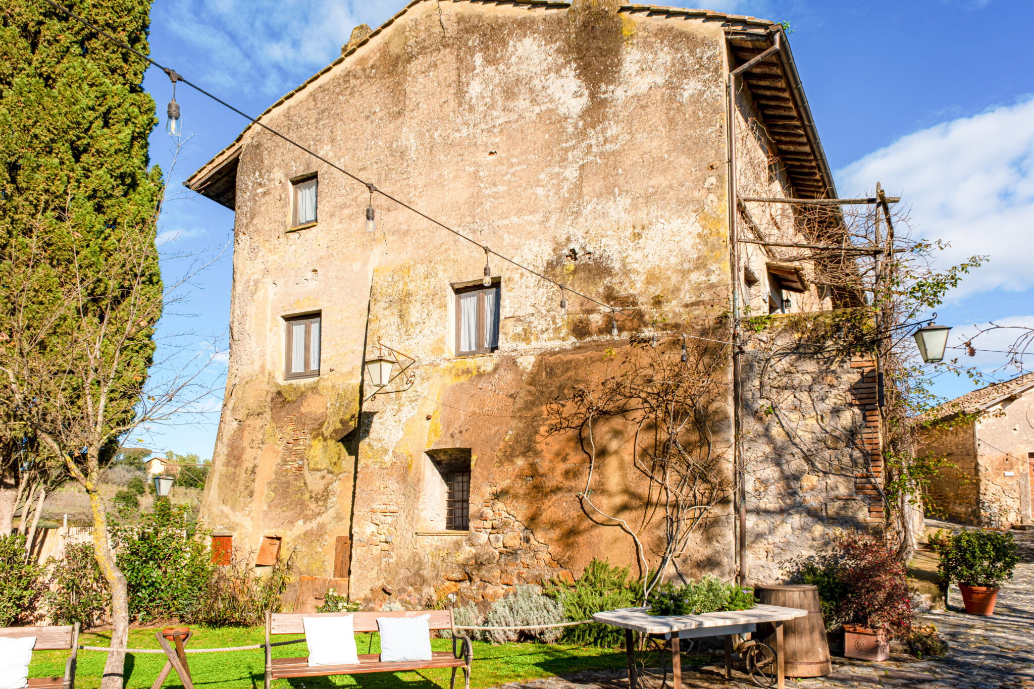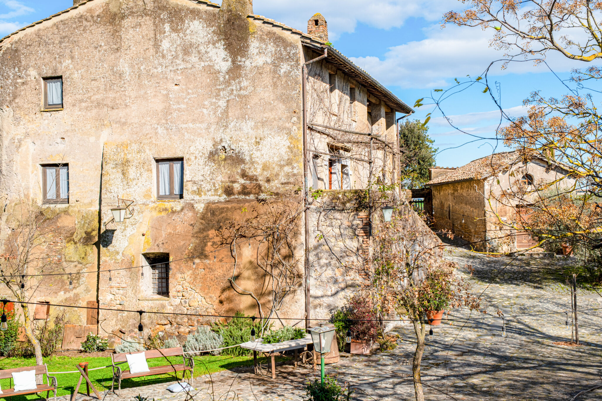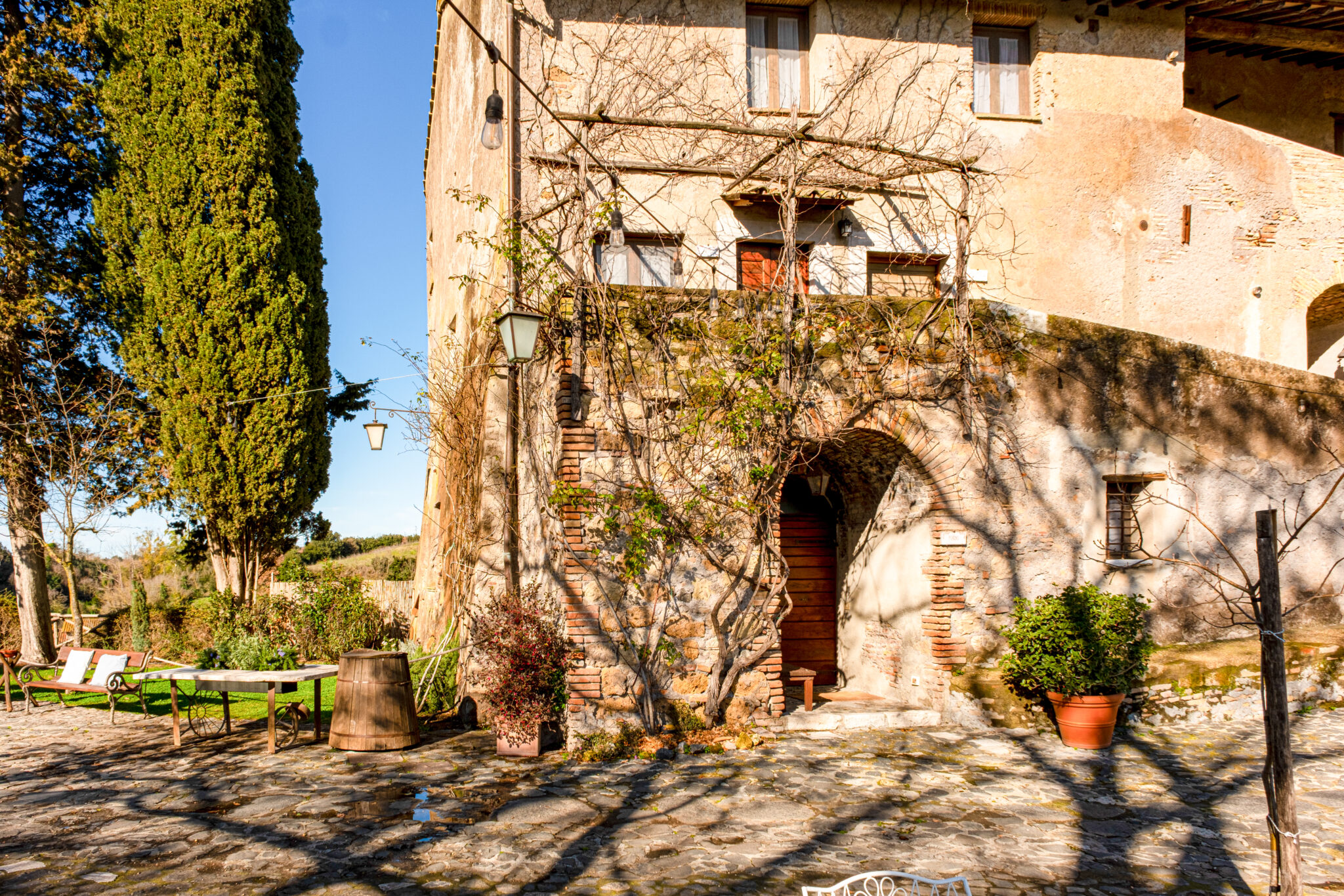 Il complesso si sviluppa all’interno di un contesto di casali e corti in pietra con giardini e terrazze affacciate sul paesaggio circostante, offrendo un’atmosfera autentica e suggestiva per eventi in ogni stagione.